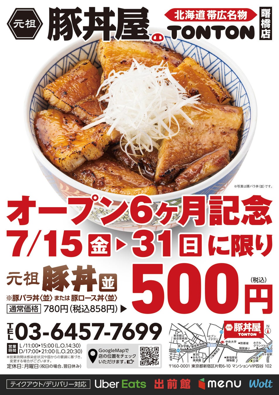 本場・北海道帯広の本場豚丼をボリュームたっぷりに味わえる「元祖豚丼屋TONTON 曙橋店」では、オープン6ヶ月を記念し、人気の「元祖豚丼(豚バラ丼・豚ロース丼)【並】」通常価格780円(税込858円)のところ、7月15日(金)〜31日(日)の期間中、限定価格500円(税込)で提供いたします。