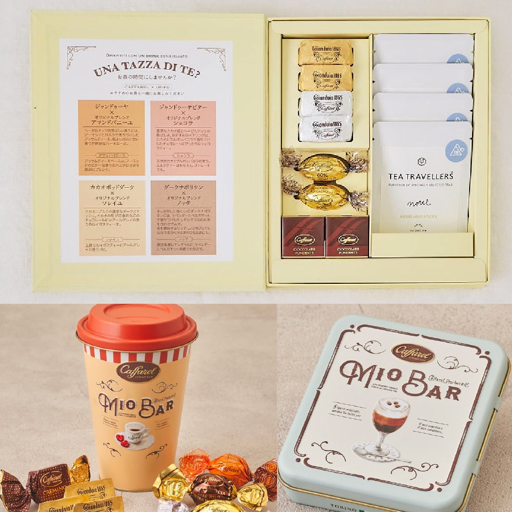 内容:芦屋の紅茶の名店「Uf-fu(ウーフ)」とのコラボレーション商品である、紅茶とチョコレートのペアリングギフトセットをはじめ、コーヒーのテイクアウトカップをイメージしたユニークな缶や、カファレルの生まれ故郷であるトリノの名物ドリンク「ビチェリン」が描かれたレトロなデザイン缶など3商品をセットにしました。定番のジャンドゥーヤをはじめ、コーヒーフレーバーのジャンドゥーヤや、大粒のヘーゼルナッツがそのまま入ったノッチョーラなど全21粒、7,200円相当の商品が入っています。※Uf-fuのティーバックは4袋アソート