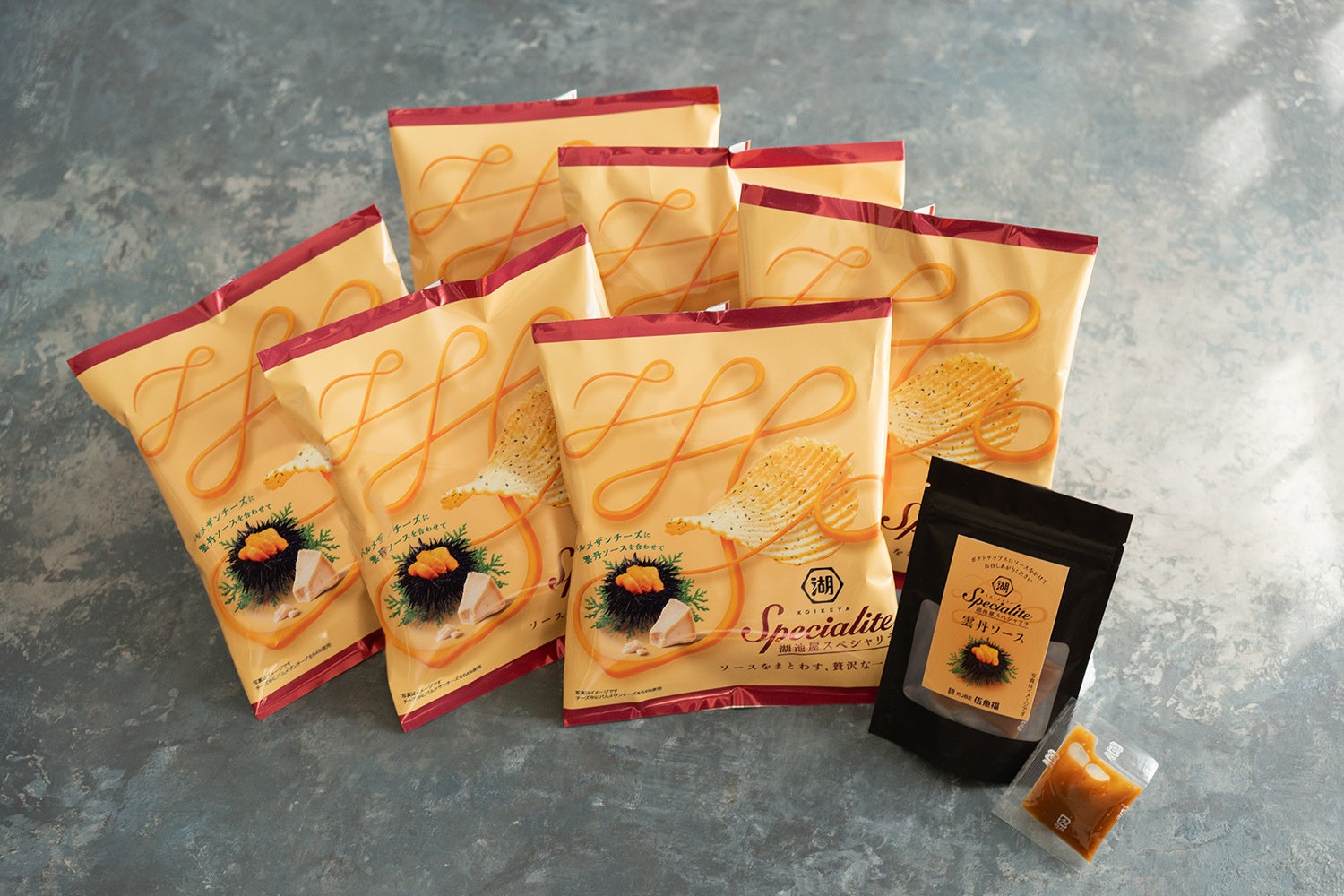 「スペシャリテ」とは、フランス料理において、その店のシェフが最も得意とする一皿のことです。日本のポテトチップスの老舗として、これまでとは違うポテトチップスの美味しい食べ方をご提案したいという想いから、じゃがいもの味わいを活かすパルメザンチーズ味のポテトチップスに、贅沢な味わいの雲丹(うに)ソースをまとわせて食べる、湖池屋の「スペシャリテ」と呼ぶに相応しい一品が誕生しました。
