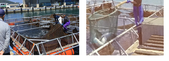 2021年11月、生簀に1,000尾のサーモンを放流し、養殖をスタート。その後も、奥尻町と当社で定期的に確認を繰り返し、奥尻町によるサーモン養殖事業をサポート。初めての作業が多く、冬場の生簀網のメンテナンスなど苦労もありましたが、サーモンは順調に育ち、無事に2022年6月9日に水揚げされ、今回、初めての出荷を迎えることができました。