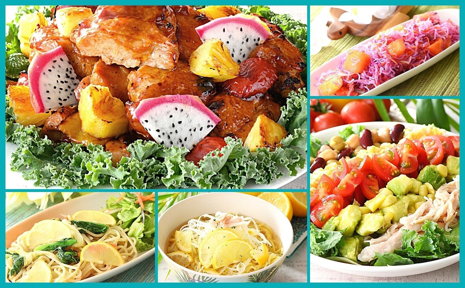 その他にも、蒸し鶏や、トマト、アボカドなど、お好みの野菜をトルティーヤチップスとともに味わう食感も楽しい『コブサラダ』や、ケイジャンスパイスの効かせた甘辛いタレに漬け込んで柔らかくジューシーな『フリフリチキン』、まさにトロピカル、ドラゴンフルーツに、マンゴーとパイナップルの爽やかな酸味と甘みがクセになる『ドラゴンフルーツと春雨のカラフルサラダ』、優しい塩味に爽やかレモンの風味が相性抜群の『フライドサイミン~ハワイ風焼きそば』など、彩り豊かなメニューが目白押し!