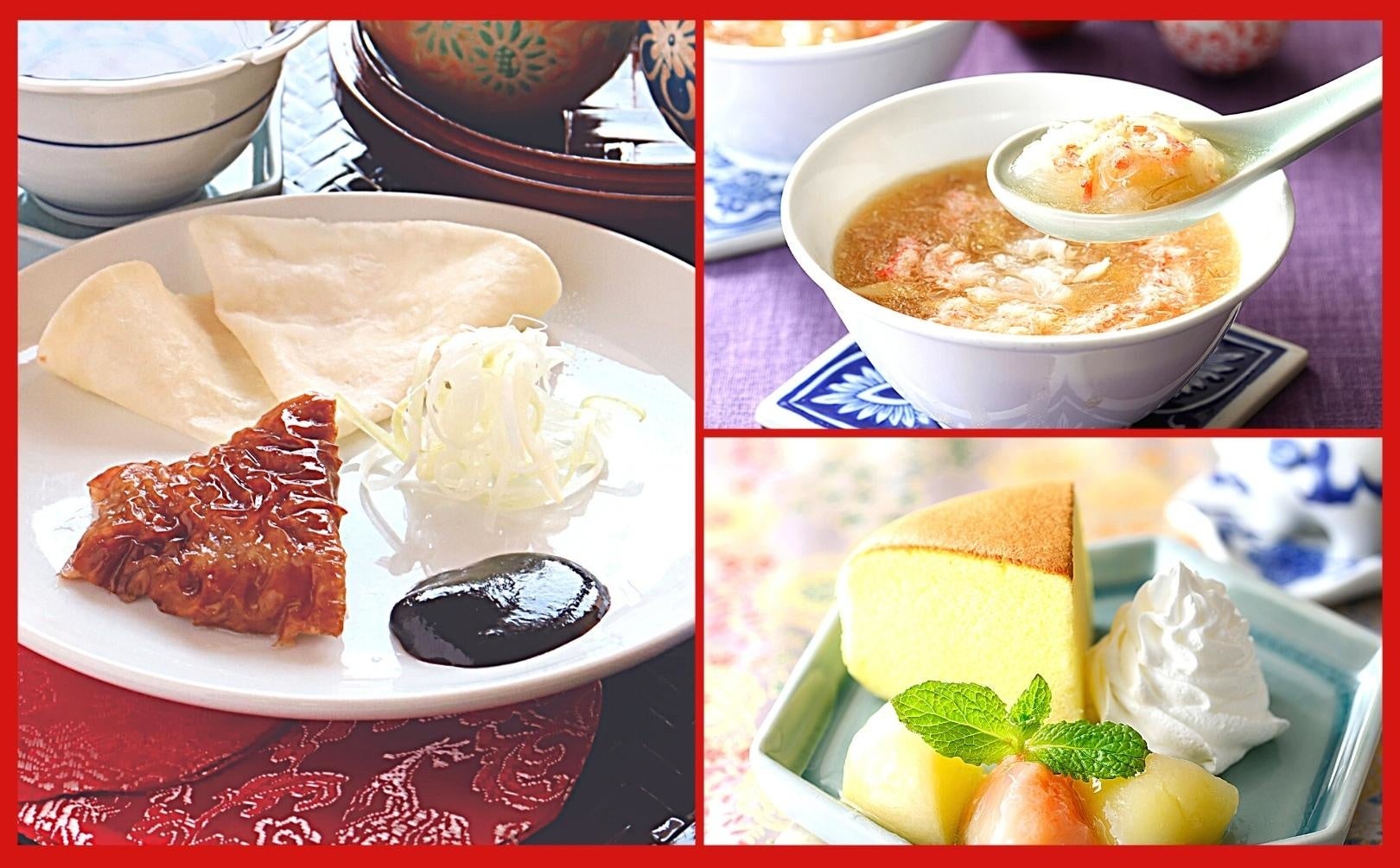 そして、プレミアムコースでは、肉厚でジューシーな『北京ダック』、こだわりのスープにフカヒレのコクが溶け込んだとろーり熱々の『ふかひれスープ』、ふわふわ食感の『台湾カステラ』が加わり、全部で9種類を贅沢にご堪能いただけます!