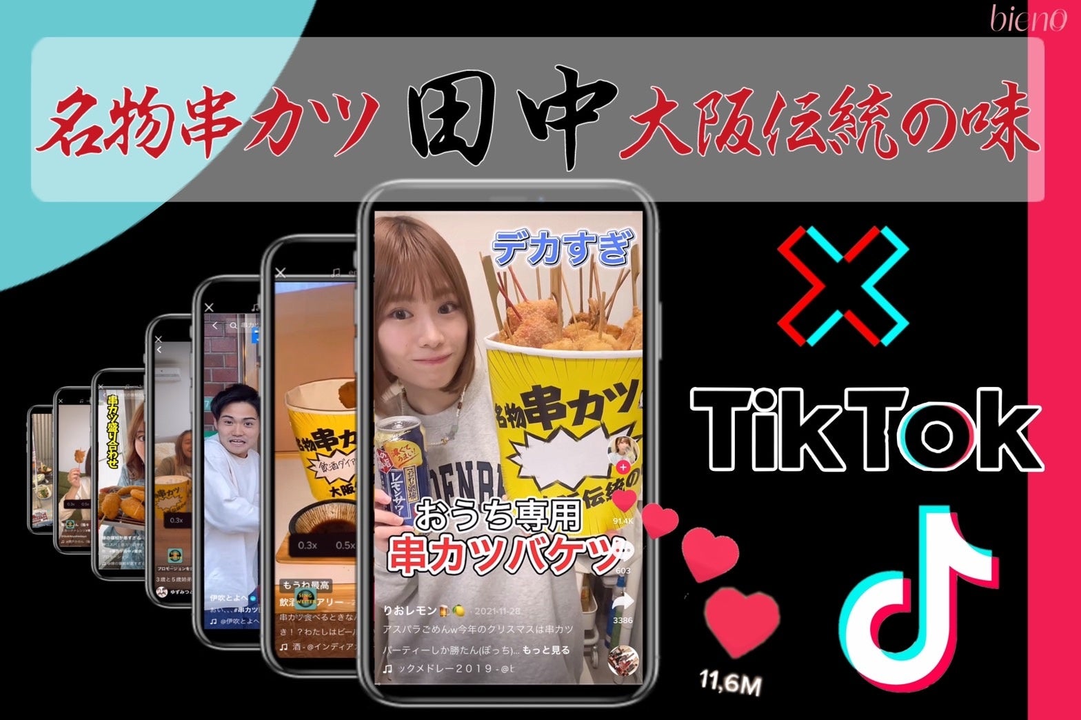 Z世代をターゲットとしたブランディング・マーケティング支援を行う株式会社bieno(ビエノ)は、全国に串カツ専門店「串カツ田中」のチェーン店を約300店舗展開する株式会社串カツ田中ホールディングス(本社:東京都品川区、代表取締役社長:坂本壽男、以下:串カツ田中)のZ世代に対する認知拡大・来店促進を目的としたプロジェクトを(期間2021年11月1日〜2022年5月21日)に実施。期間中のエンゲージメントは通常の4倍、『串カツバケツ』の売上は204%※にアップする結果となりました。仕掛け人としてZ世代からの圧倒的な支持(SNS総フォロワー数約1000万人)を誇るクリエイターが「”PR動画を発信”するクリエイター」ではなくマーケッターとしてプロジェクトに参画。