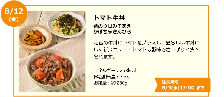 大きな特長は、「1食あたり400kcal以下」、「1食で1日の野菜目標量の約1/2がとれる」、「週間平均食塩相当量3.2g以下」、という3点を考慮して作られていること。