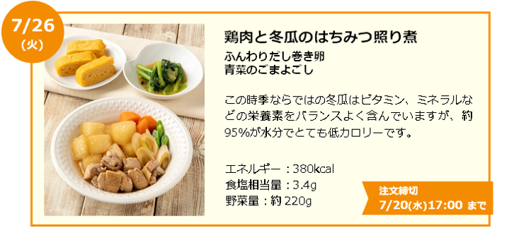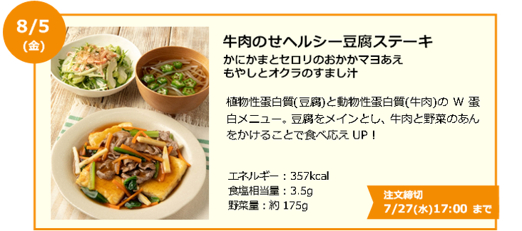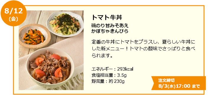 大きな特長は、「1食あたり400kcal以下」、「1食で1日の野菜目標量の約1/2がとれる」、「週間平均食塩相当量3.2g以下」、という3点を考慮して作られていること。