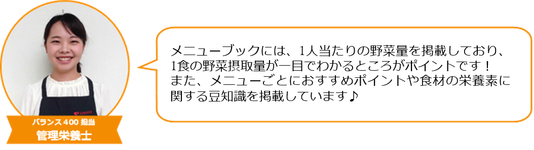 ヨシケイとして、『バランス400』のターゲット層を、生活習慣病の気になる中高年世代と設定し、400kcal以下の設定としました。主食を除く、おかずのみのエネルギー量設定にすることで、ご飯の量の調節で男女差や活動量に合わせて幅広い方にご利用いただけます。