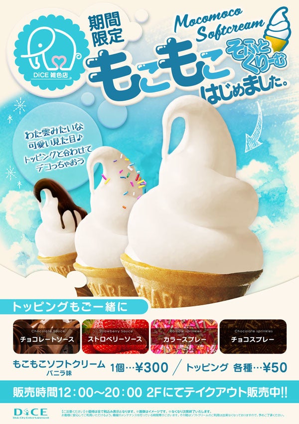 株式会社シティコミュニケーションズ(本社:神奈川県横浜市/代表取締役社長:三田 大明)が運営するインターネットカフェ「DiCE(ダイス)雑色店」は、7月11日より『ソフトクリームに本気すぎるネットカフェ』として、 “もこもこソフトクリーム”の販売を開始いたします。