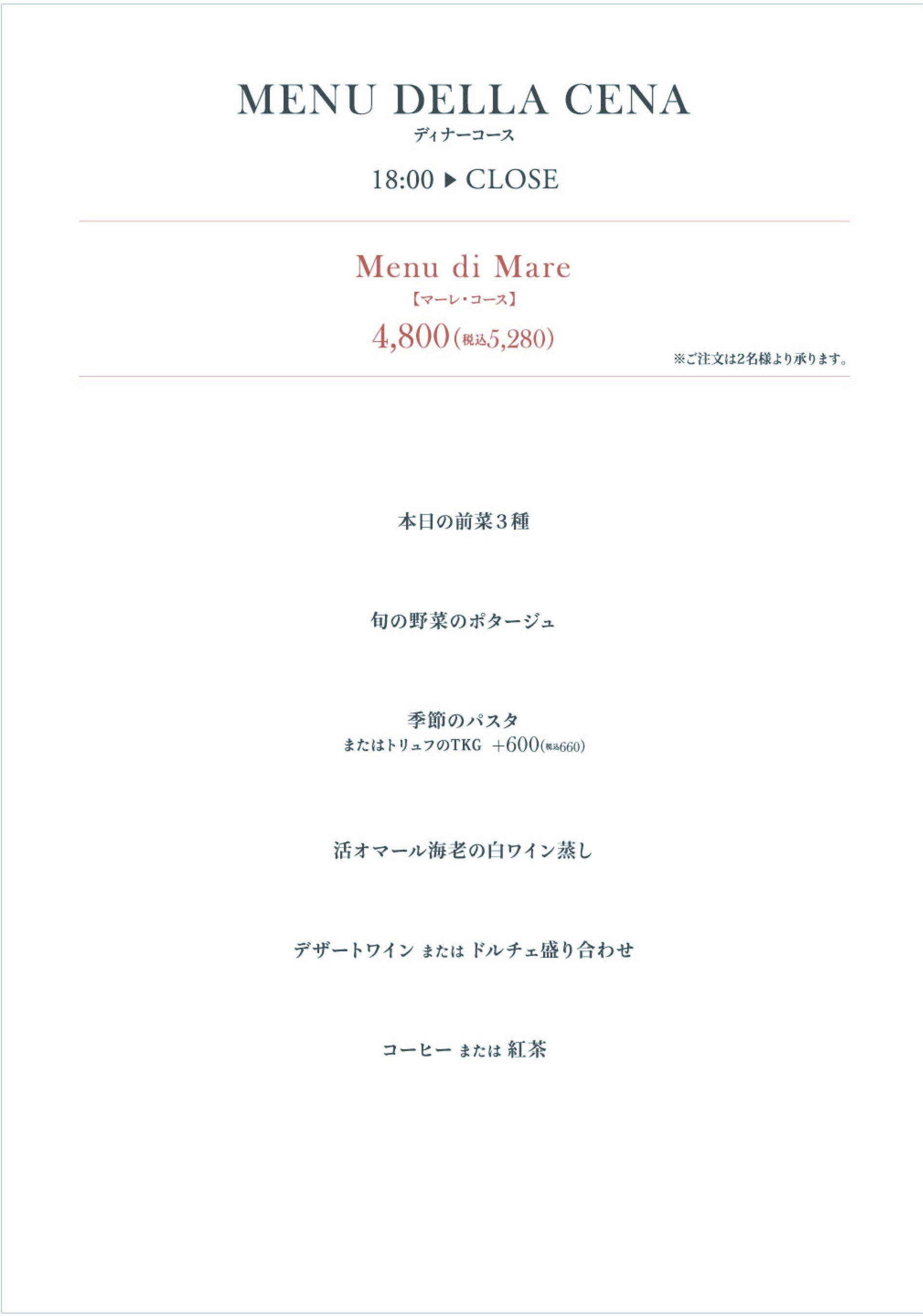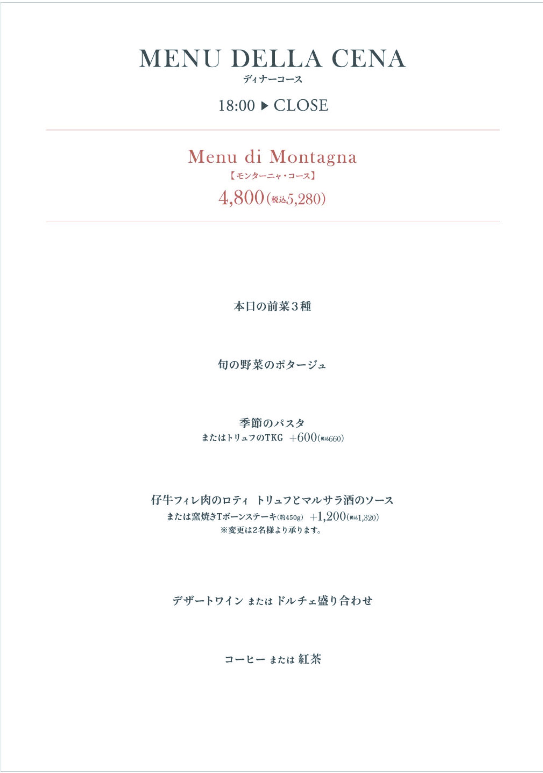 海の幸をメインにした「マーレ・コース」とお肉料理がメインの「モンターニャ・コース」は、それぞれプラス税込660円で季節のパスタをトリュフのTKGに変更いただけます。さらに、モンターニャ・コースはメインのお肉料理を、プラス1,320円で窯焼きTボーンステーキ(約450g)に変更いただけます。