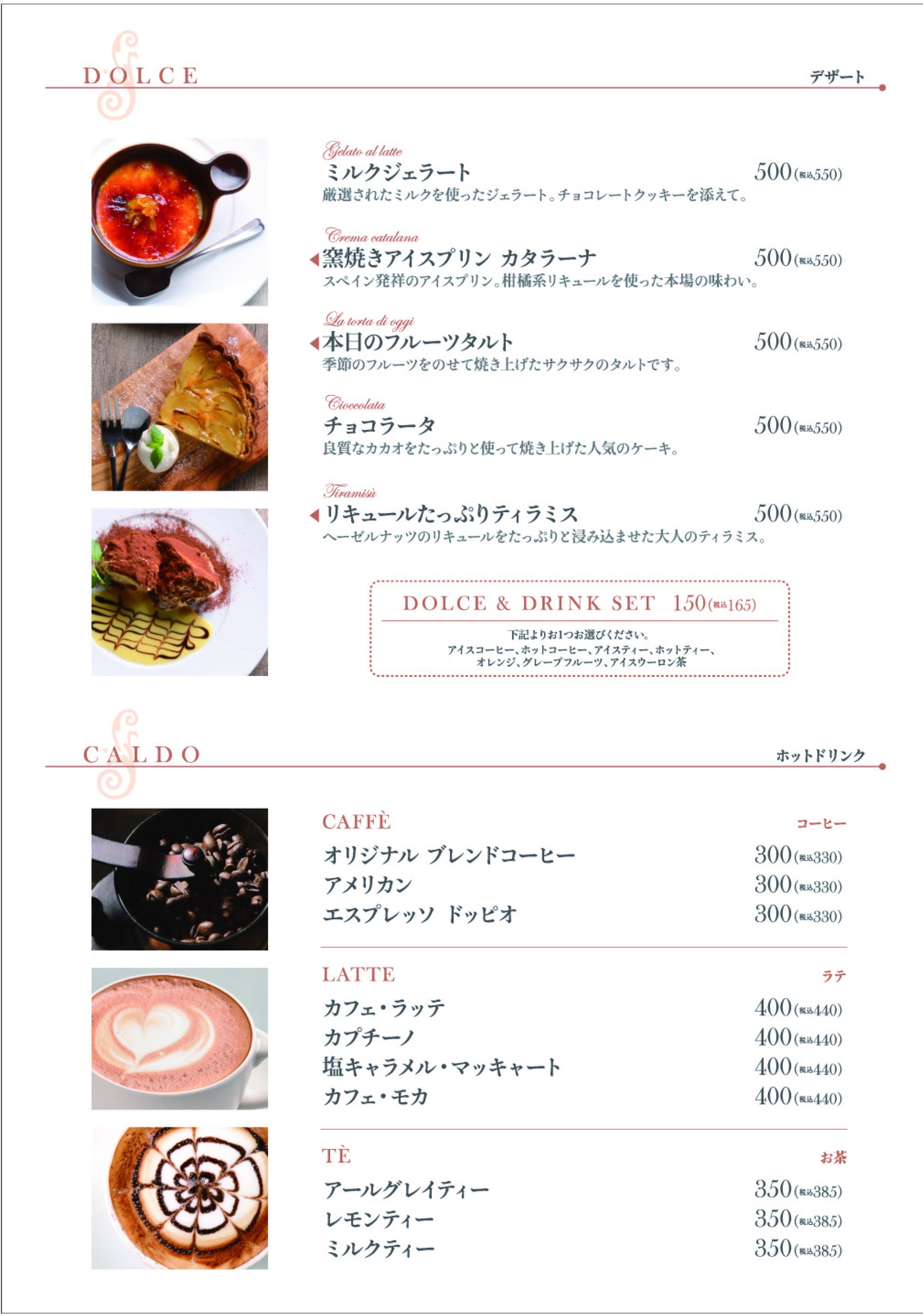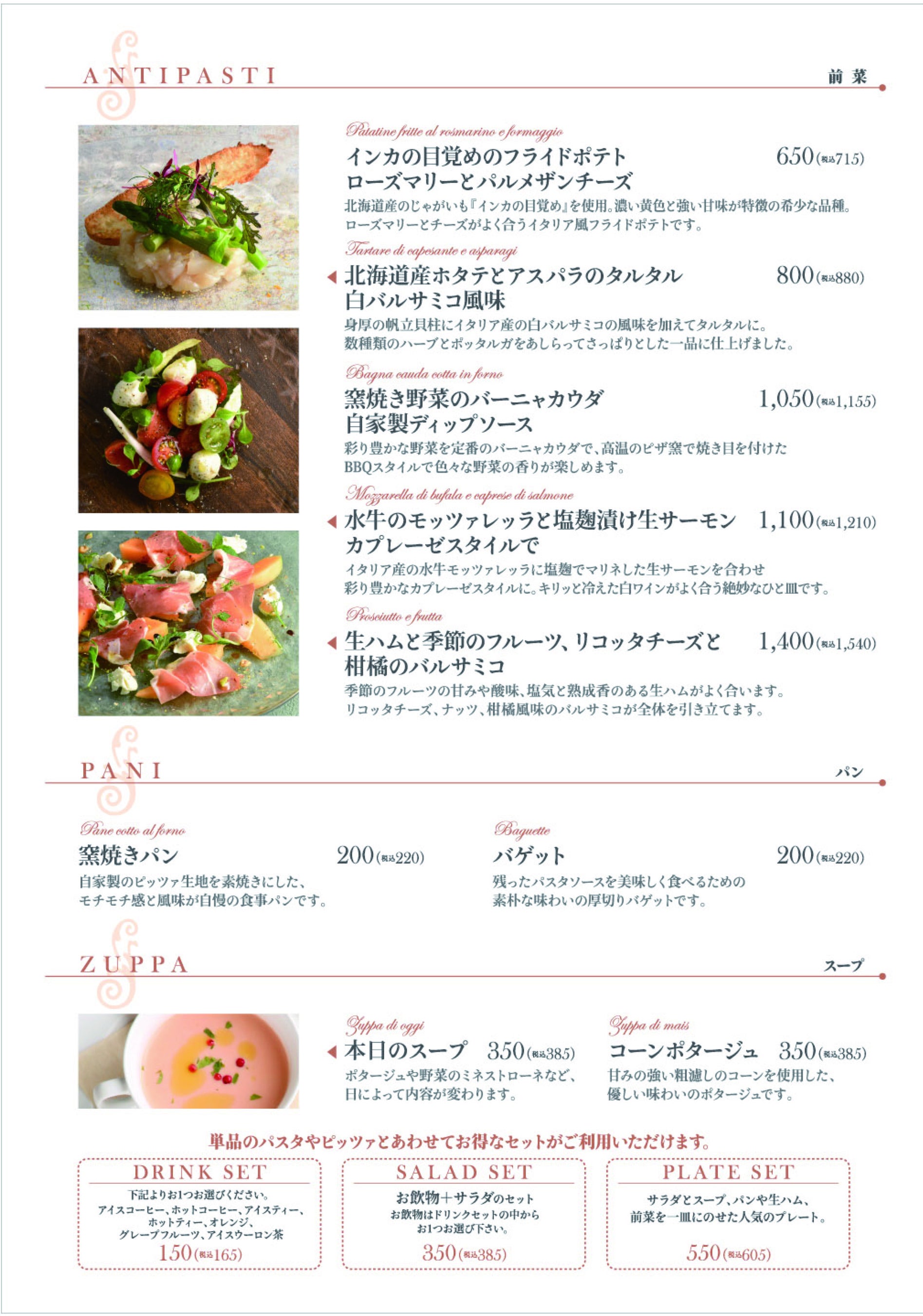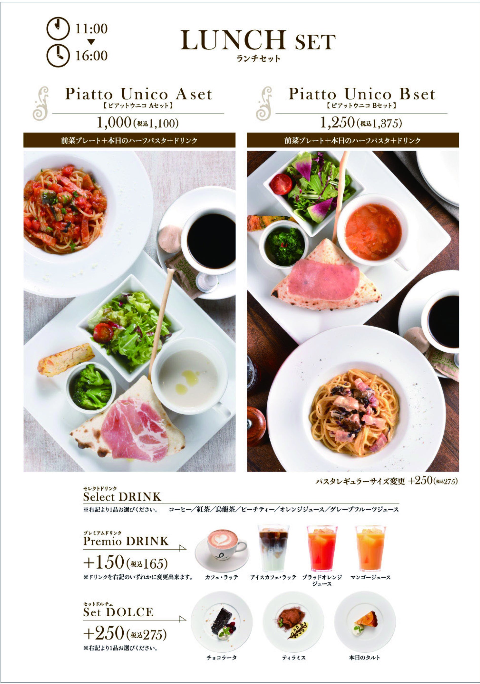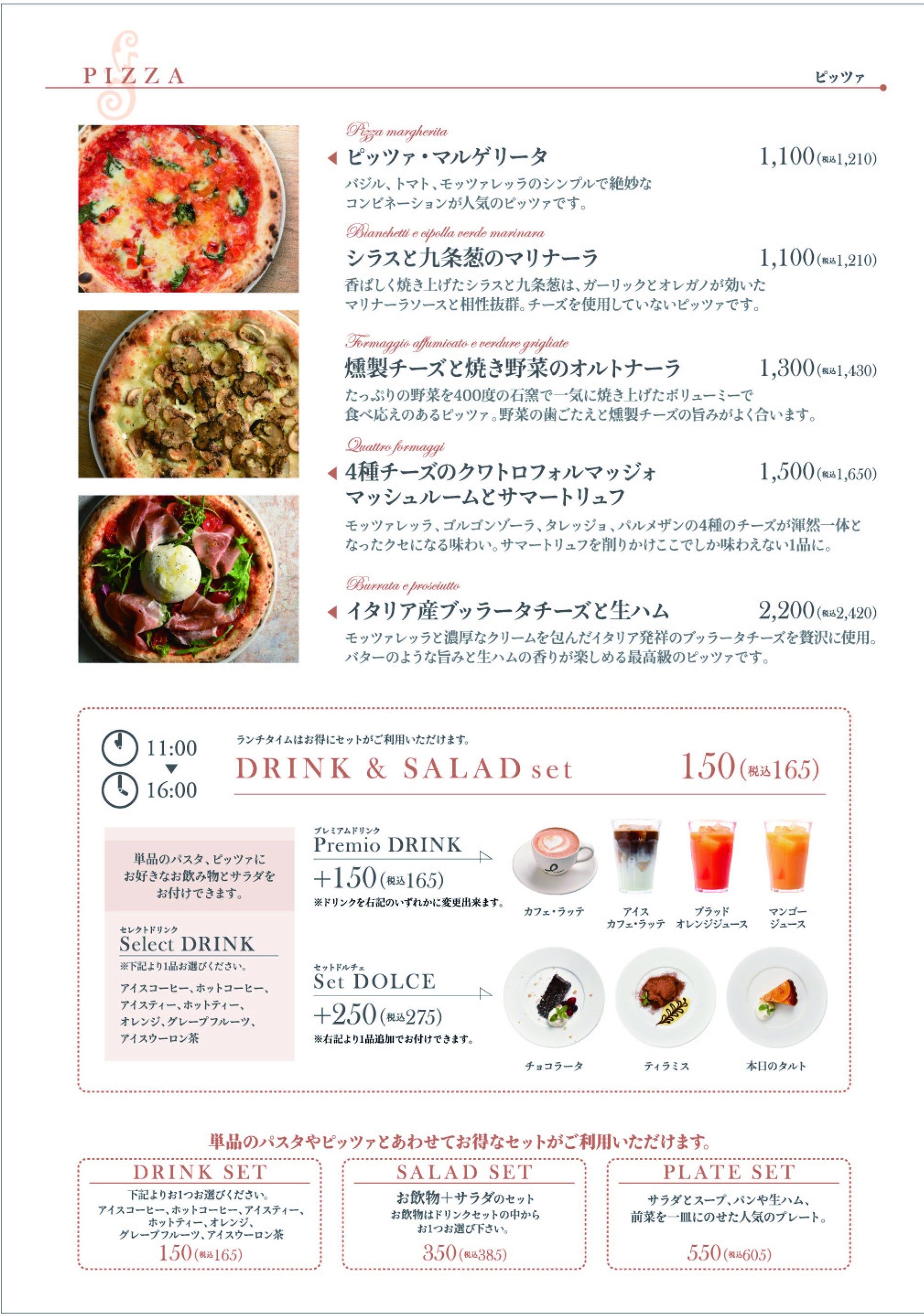 その他、11時~16時限定で前菜盛り合わせとハーフパスタにドリンク付きのランチセット2種類を、11時~18時には、窯焼きピッツァなど本格イタリアンを気軽にお楽しみいただけるグランドメニューご用意いたしました。