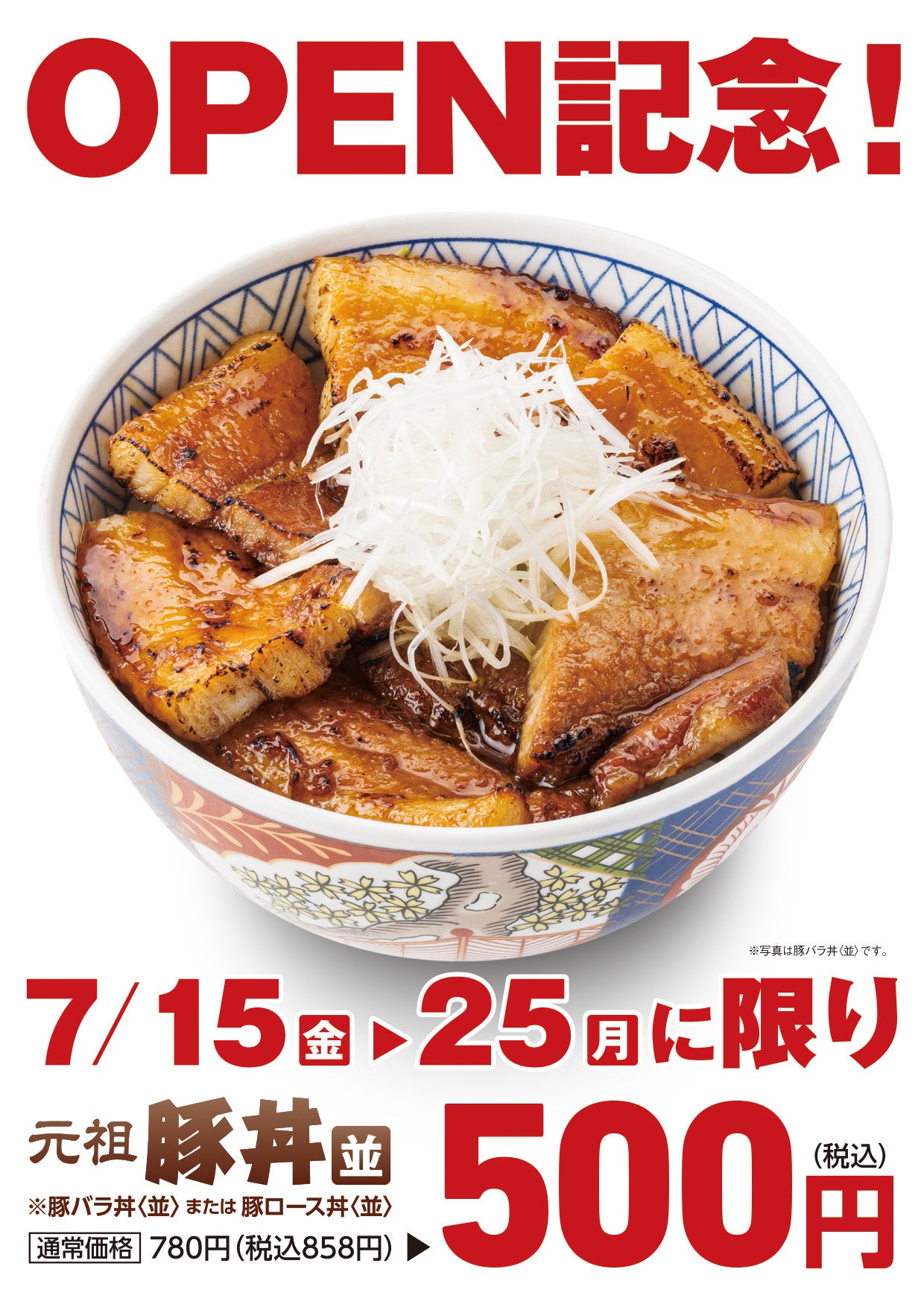 直江津店のオープンを記念して、7/15(金)〜25(月)の期間中、当店自慢の「豚バラ丼〈並〉」または「豚ロース丼〈並〉」を特別価格500円(税込)にて提供いたします。