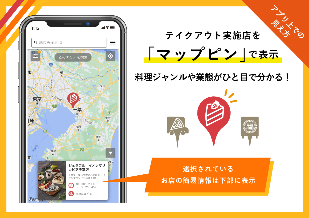 ジェラフルのテイクアウト実施店がマップピン(ジャンル:スイーツ)で表示されます。