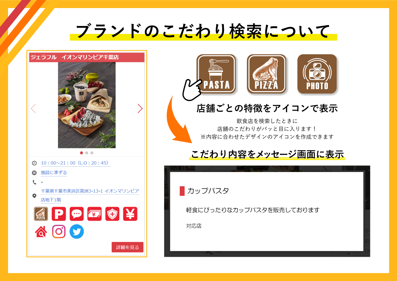 従来のアプリでのテイクアウトのPRに加え、ブランド専用ポータルでは、店舗一覧表示、独自エリア絞込機能、ブランドこだわり検索機能を利用することでブランドPRも実現いたします。