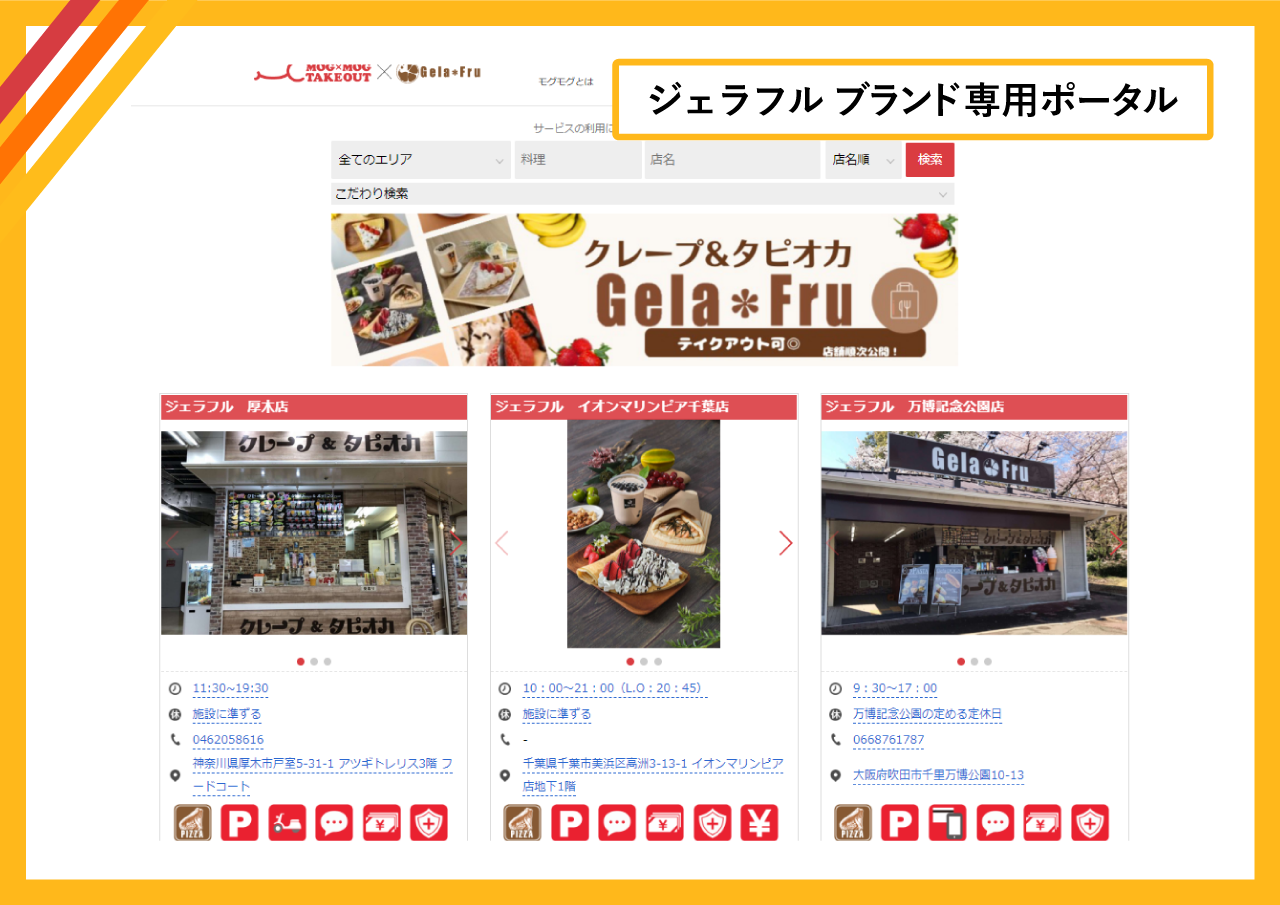 株式会社ジールプロダクト(本社:福岡市中央区、代表取締役社長:林田 浩幸)が運営する、テイクアウトPRサービス「モグモグテイクアウト」は、株式会社ジェラフル(本社:東京都品川区、代表取締役:吉田達二郎)のブランド専用ポータルを7月15日にリリースいたします。順次掲載店舗追加予定です。