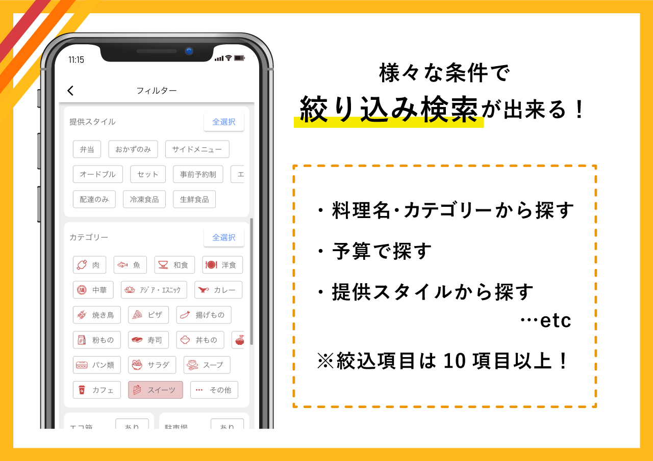 その他にも出店形態、提供スタイル、カテゴリーなど様々な条件で絞り込み検索することができます。
