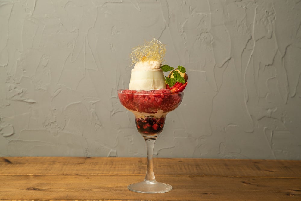 ストロベリーグラニータと、ベリー&バルサミコのソースで酸味の効いた甘酸っぱい味わいです。ベリーの赤色が見た目にもおいしそうな爽やかなフレーバー。