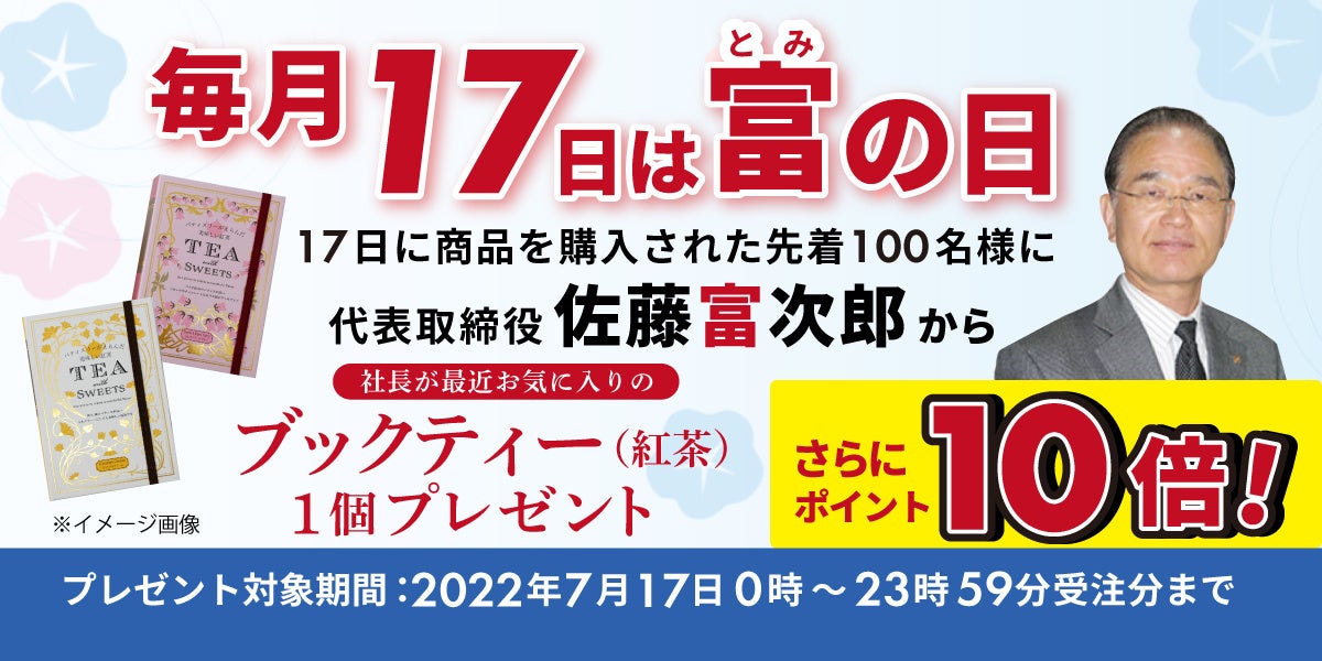 佐藤のラッキーナンバー「17」と佐藤の名前・富次郎から、弊社では17日を「富の日」と制定し、お客様に感謝の気持ちを込めて、毎月17日にプレゼントキャンペーンを開催します。