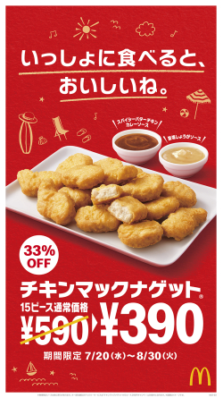 日本マクドナルド株式会社(本社:東京都新宿区、代表取締役社長兼CEO:日色 保)は、人気のサイドメニュー「チキンマックナゲット 15ピース(ソース3個付き)」を33%OFFの特別価格390円(通常価格590円・税込)で販売するキャンペーンを7月20日(水)から8月30日(火)までの期間限定で実施いたします。キャンペーン期間中は、2種類の新しい期間限定ソース「スパイシーバターチキンカレーソース」と「旨塩しょうがソース」が登場し、定番の「バーベキューソース」および「マスタードソース」と合わせ、全4種類からお好みのソース3個をお選びいただけます。