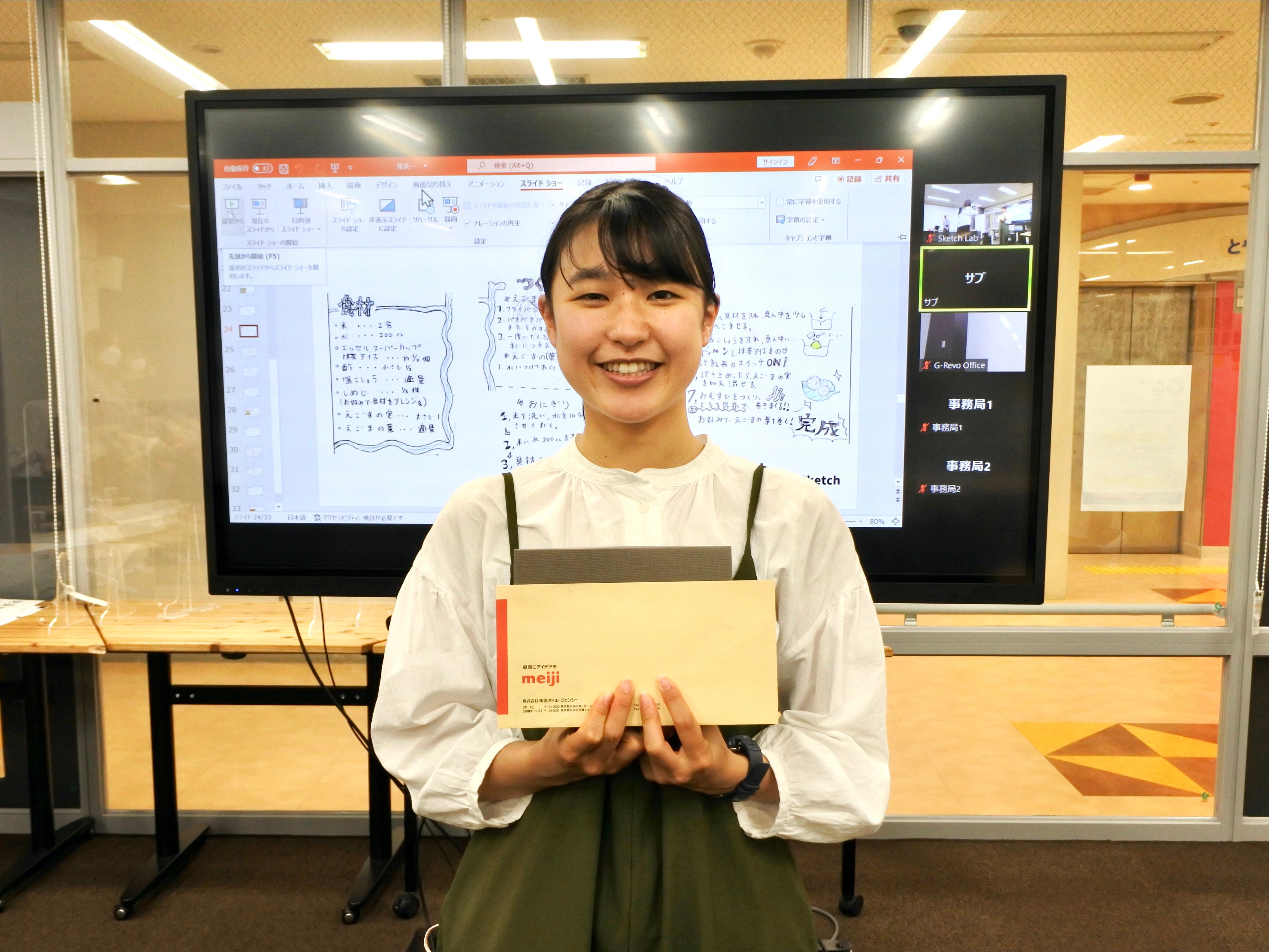 今回は富山県富山市の後援で、未来共創拠点施設「Sketch Lab(スケッチラボ)」の学生研究員からレシピを募り、プレゼンテーション形式で選考会を実施。数々の応募の中で「えごま元気おにぎり」が選ばれました。