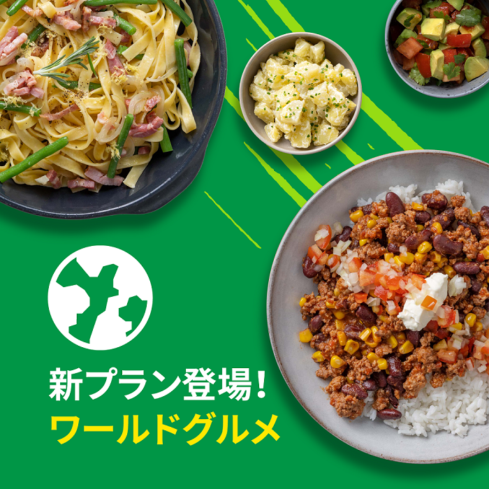 7月4日(月)より、世界各国のこだわりグルメをお届けする新たなミールプランとなる「ワールドグルメ」を追加しました。さらに7月15日(金)からは注文から配達までの日程を一部短縮します。メニュー決定からお届けまでの期間が短くなり、より快適にサービスをお楽しみいただけるようになりました。また、8月7日(日)配達週以降、週替わりのメニューが12種類(現在10種類)になり、より多くのラインナップから、お客様の好みにあったメニューをお選びいただけます。