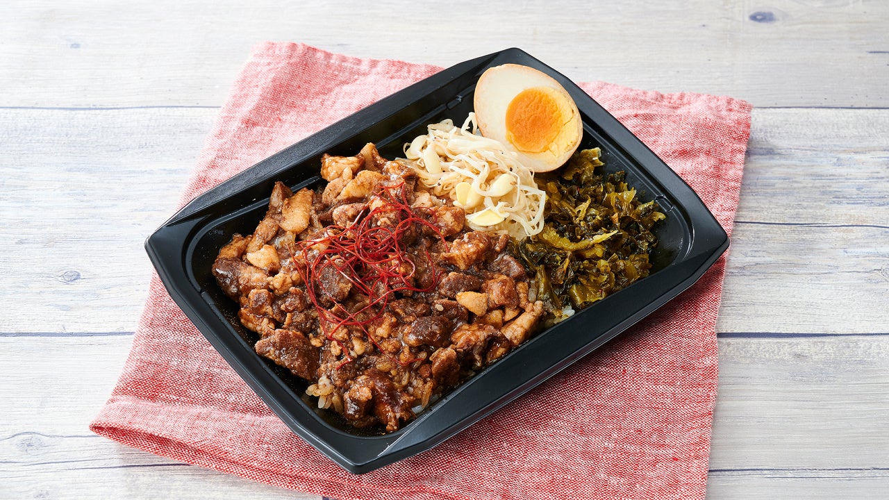 甘辛く煮込んだ豚肉に五香粉(八角・丁香・肉桂・花椒・小茴香)を加え、煮玉子、高菜漬、七味もやしを添えました。