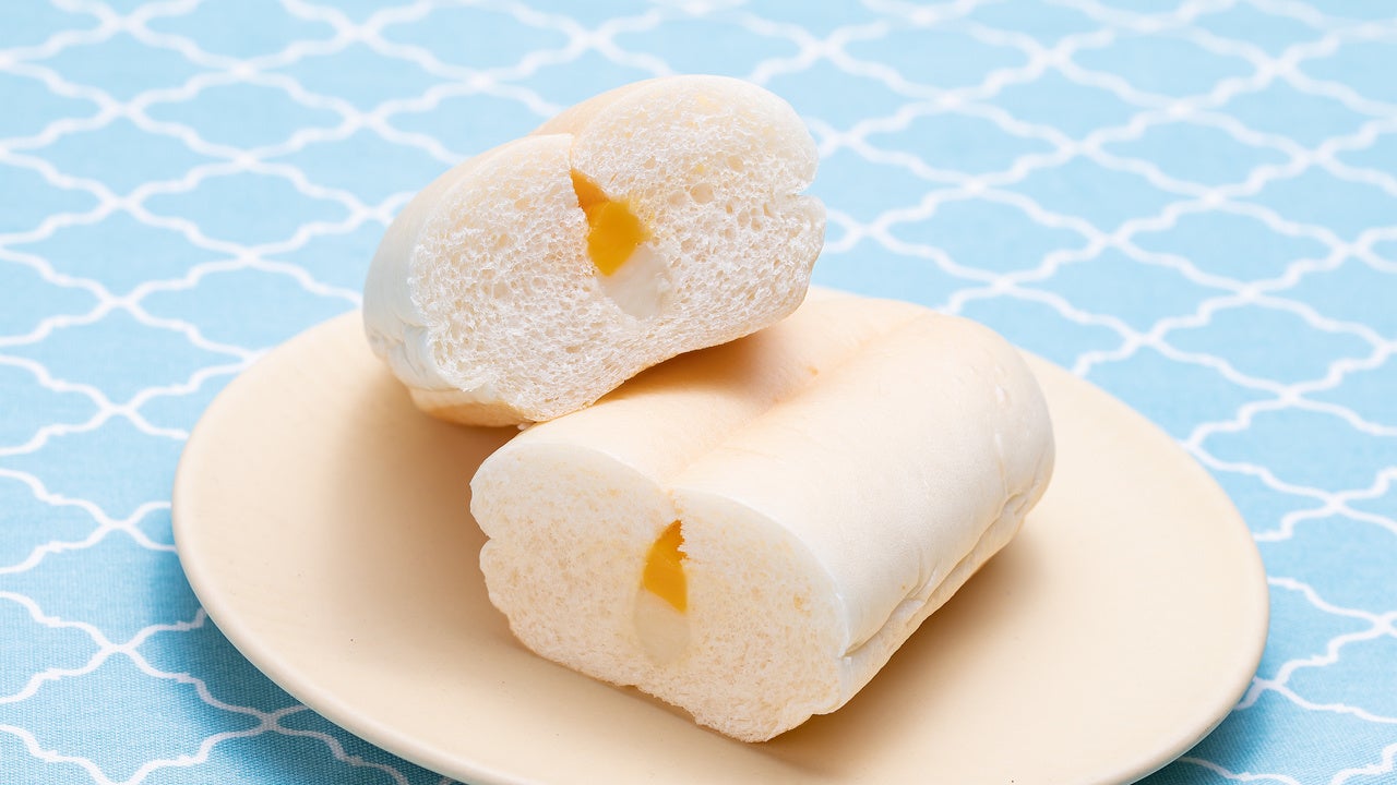 爽やかな杏仁クリームと濃厚なマンゴークリームを2層に重ね、ふんわりとした白いロールパンに挟みました。