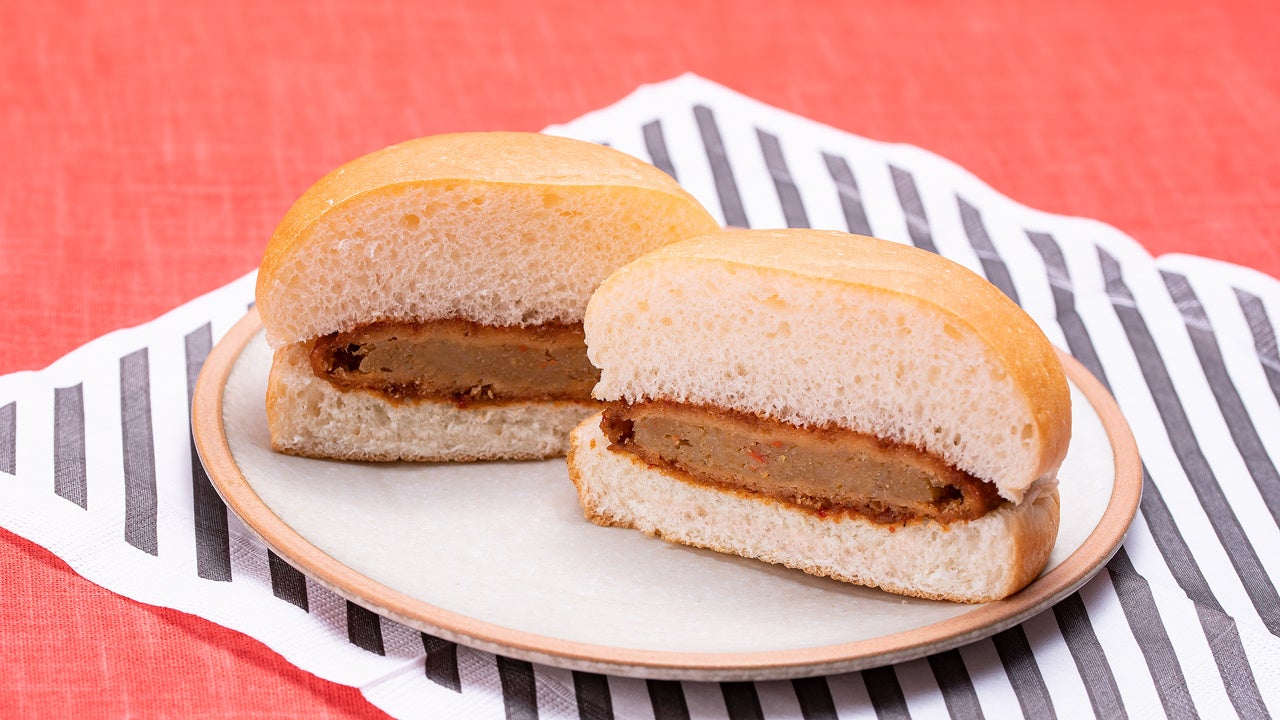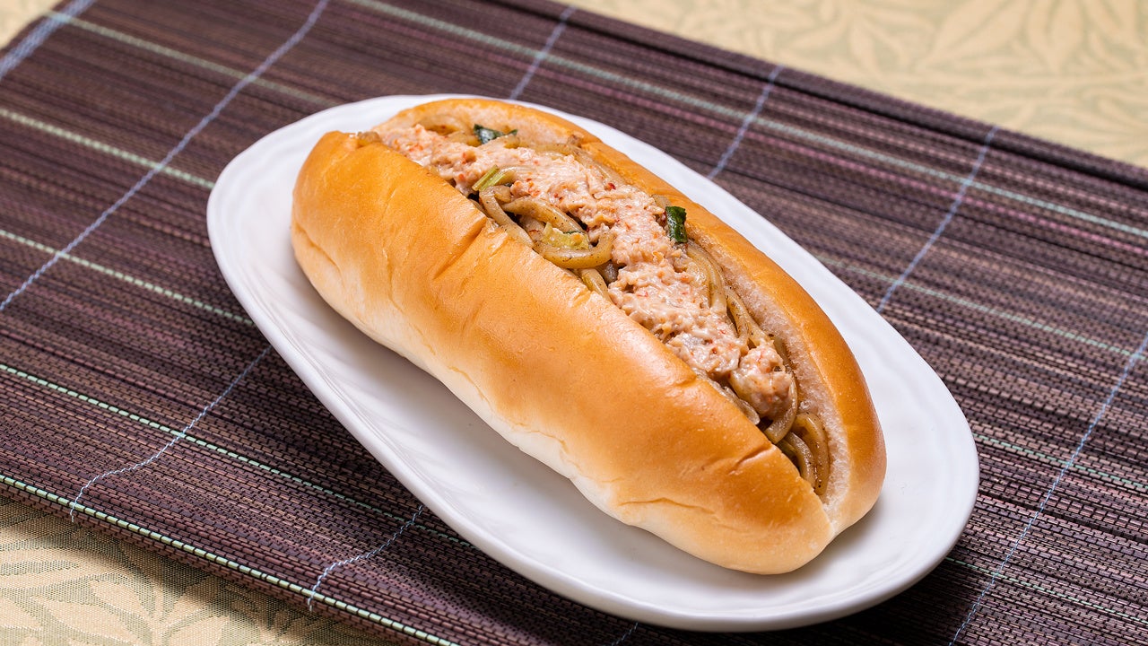 台湾風まぜそばをイメージしたまぜそばを、ロールパンにはさみました。