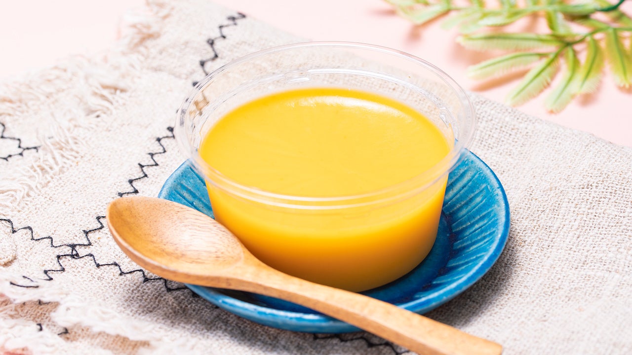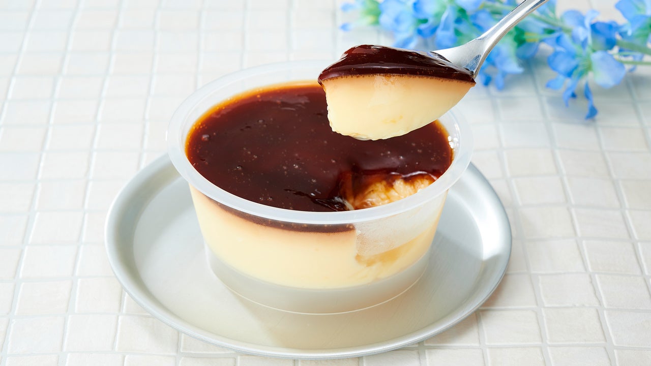 砂糖のかわりに練乳を使い、やさしい味わいに仕上げた、固め食感のたまごプリンです。