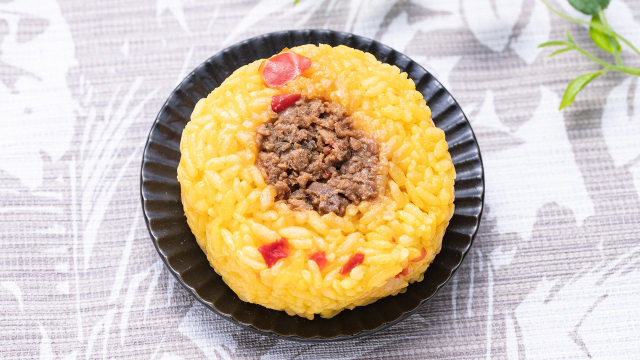 ひき肉と野菜のバジル炒めに卵黄ソースを加え、イエローライスにトッピングしました。
