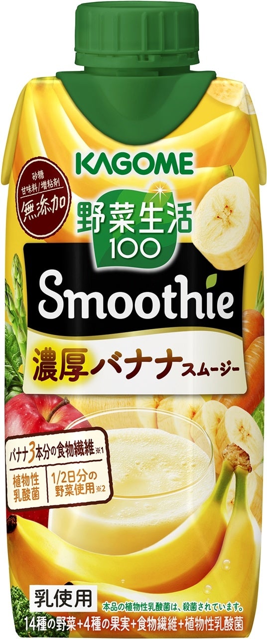 この度発売する「野菜生活100 Smoothie濃厚バナナスムージー」は、濃厚でクリーミーなバナナのおいしさにこだわったスムージーです。バナナ3本分の食物繊維※2が摂れ、植物性乳酸菌※3もとることができます。朝食時や、まったりとリラックスしたい時におすすめです。