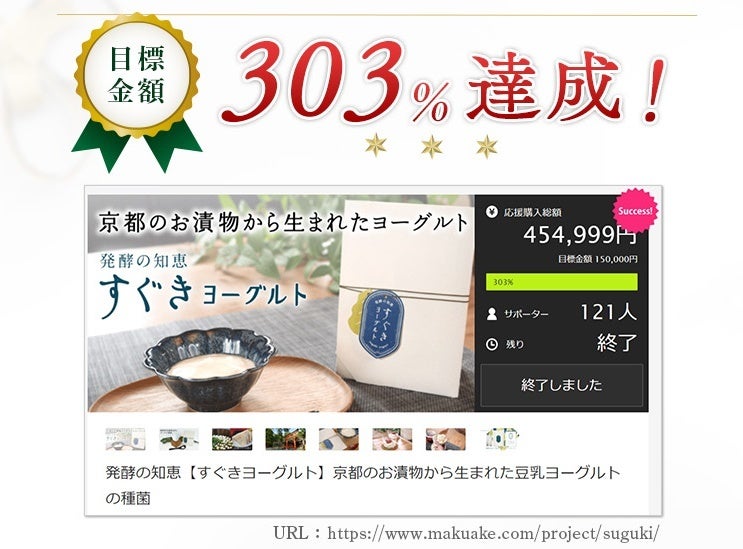 おかげさまでMakuake掲載初日に目標金額を達成し、目標達成率は303%、121名の方にご購入いただきました。多くの方々に応援いただき、すぐきヨーグルトを皆様にお届けすることが叶いました。たくさんのご声援に心より感謝申し上げます。