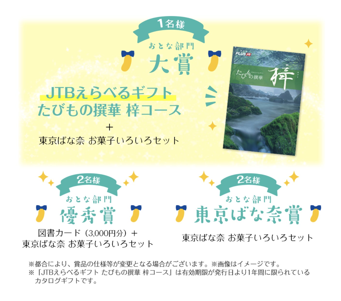 大賞(1名様):「JTBトラベルギフト」(30,000円分相当)+東京ばな奈 お菓子いろいろセット