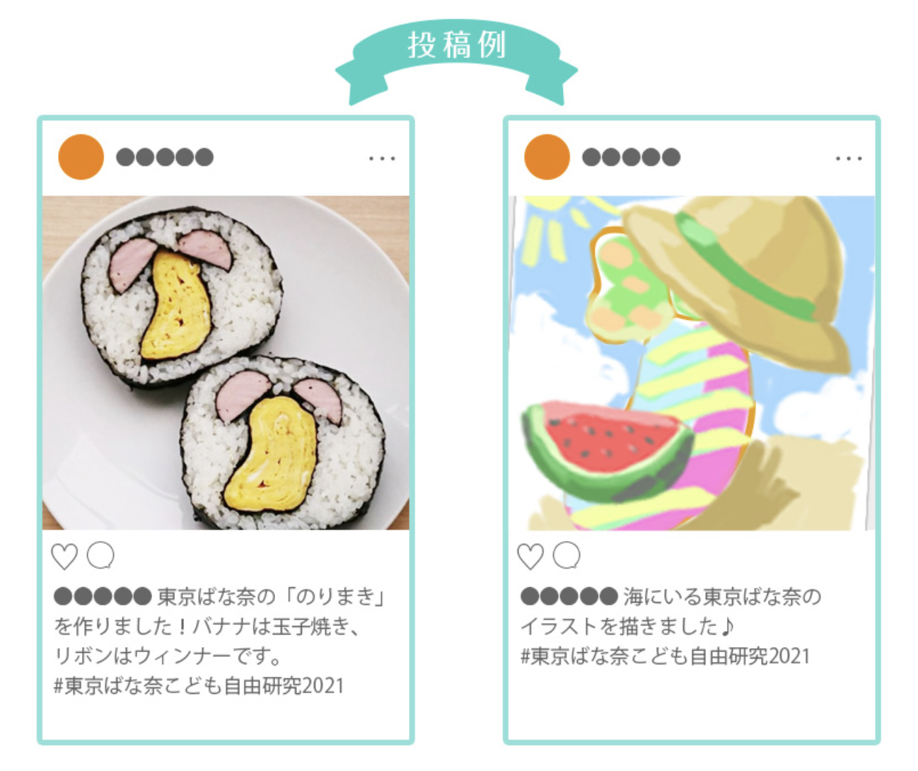作品内容と頑張ったところを書いて、ハッシュタグ「#東京ばな奈こども自由研究大賞2021」を付けて、InstagramまたはTwitterに投稿。