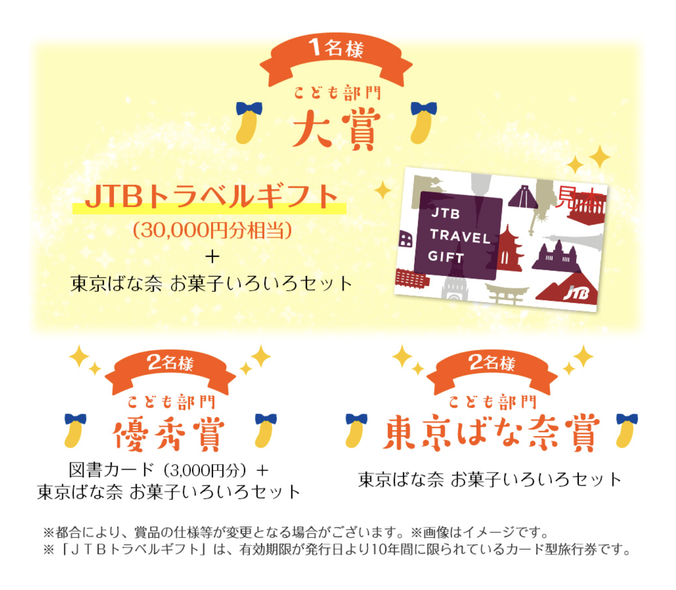 大賞(1名様):「JTBトラベルギフト」(30,000円分相当)+東京ばな奈 お菓子いろいろセット