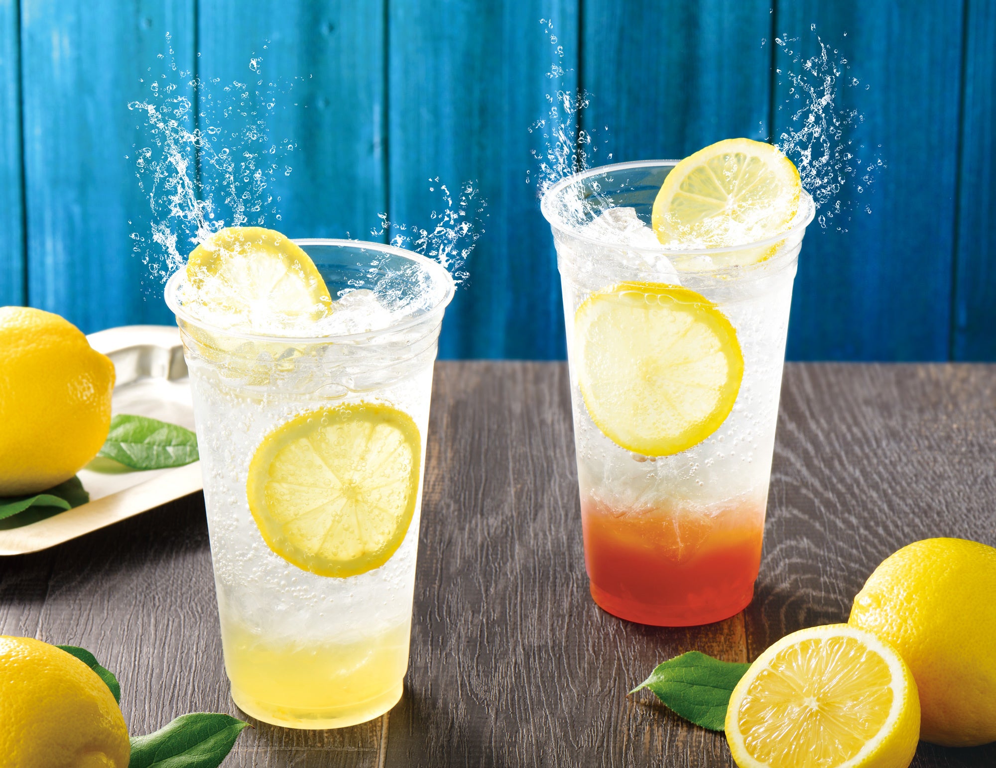 ■「爽やかレモンスカッシュ〜瀬戸内レモンピール入り〜」(手前) ¥490〜