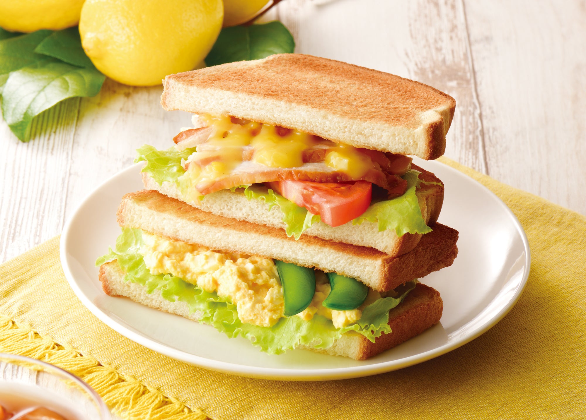 フードメニュー「2つのサンド 日南どりの瀬戸内レモンソースとたまごサラダ」は、上下で異なる味わいをお楽しみいただけるトーストサンドです。上段はローストした宮崎県産の日南どりに、瀬戸内レモンの果汁とピールを使用したレモンクリームソースをあわせた、爽やかな酸味とまろやかな味わいが特長のサンドです。食感のアクセントに刻んだ玉ねぎを加えました。下段はたまごサラダとほんのり甘いスナックえんどうを重ね、彩り鮮やかに仕上げました。
