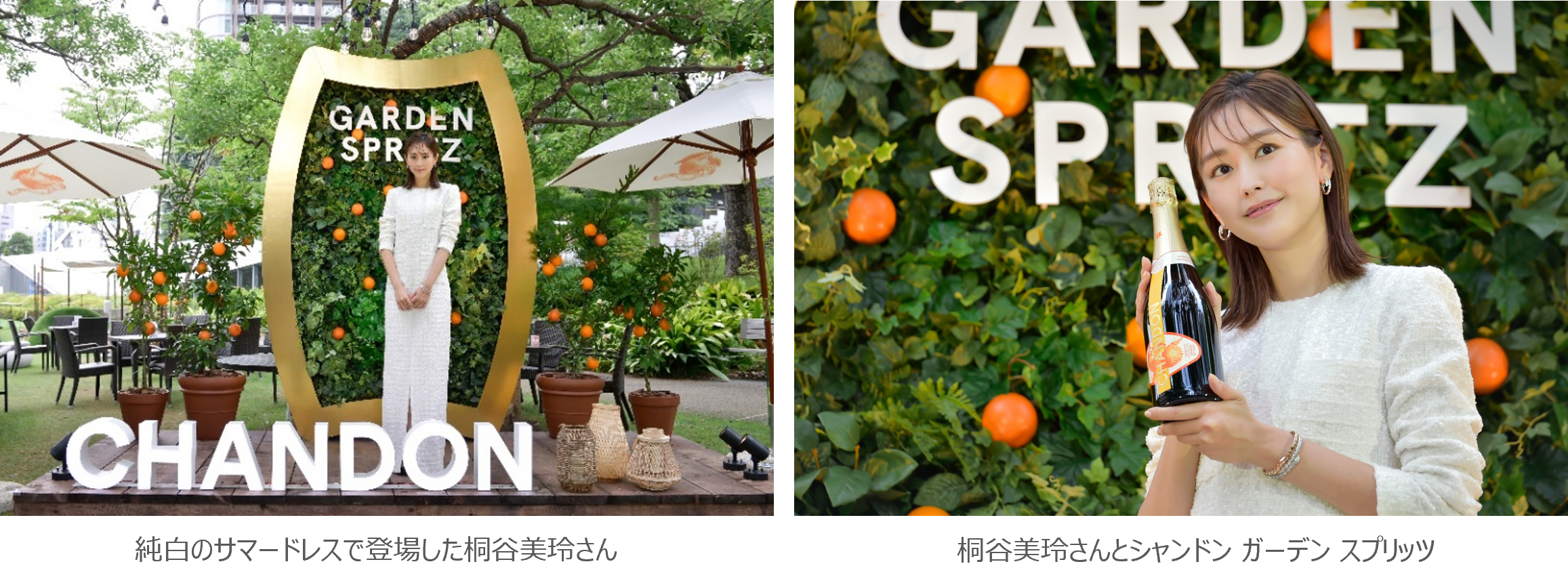 オープニングセレモニーには、女優の桐谷美玲さんが夏らしい純白のサマードレス姿で登場。今年の夏やりたいことは、”ホームパーティ―やガーデンパーティー”と回答しました。ホームパーティーではどんな料理をするかを聞かれると、「季節のフルーツを使ったサラダなどを作るのが好きで、今の時期だとキウイや、もう少ししたら桃とか」と、お料理上手な一面が垣間見れました。 また、その様な お料理と合わせる飲み物については、「ワイン系を飲むことが多いです。でもやっぱり乾杯の時にはシュワシュワしたいですね!」と、語ってくれました。セレモニー中、第1号のお客さんとして『シャンドン ガーデン スプリッツ』を「いただきます」と笑顔で召し上がり、 「綺麗ですね~。凄く香りがよくて、でも後味スッキリとしていて飲みやすいですね。」とコメント。日頃からスパークリングワインを嗜まれる桐谷さんも、氷を入れて楽しむ「シャンドン ガーデン スプリッツ」を気に入っていました。MCから美と健康の秘訣はと聞かれると、「美味しさや栄養がつまっているので、なるべく旬のものを取り入れるようにしています」と、語っていました。