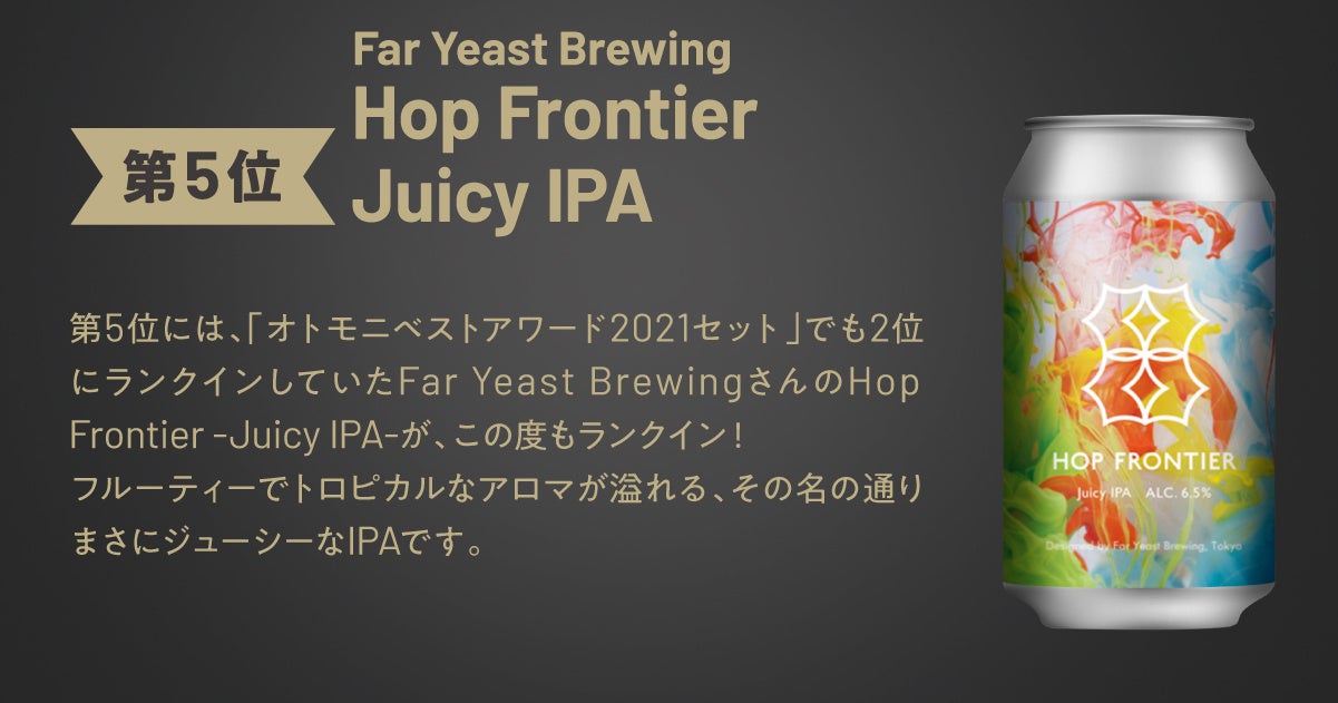 「オトモニベストアワード2021セット」でも2位にランクインしていたFar Yeast BrewingさんのHop Frontier -Juicy IPA-。フルーティーでトロピカルなアロマが溢れる、その名の通りまさにジューシーなIPAです。