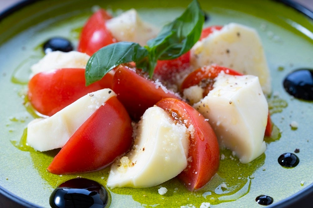 山梨県の女性酪農家「Mt. Fuji Craft Farm」によるモッツアレラチーズと、トマトをたくさん使ったサイドメニューの一品。
