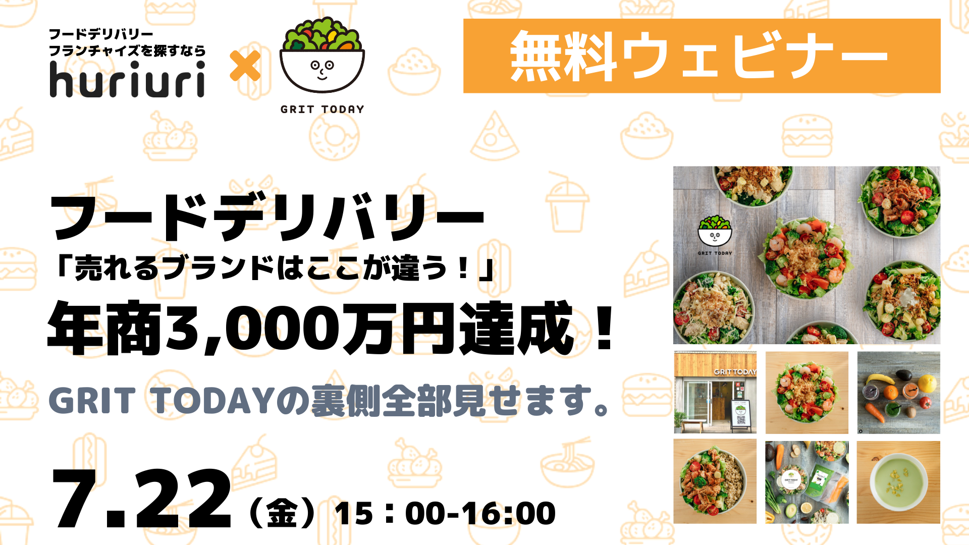 今回は、フードデリバリー事業において高い実績を誇るGRIT TODAYの運営ノウハウやブランドシェア事業に関して解説致します。GRIT TODAYではブランドシェア事業の一環としてフランチャイズ加盟店を全国で募集しております。加盟条件などもウェビナー内で詳しく解説させていただきます。