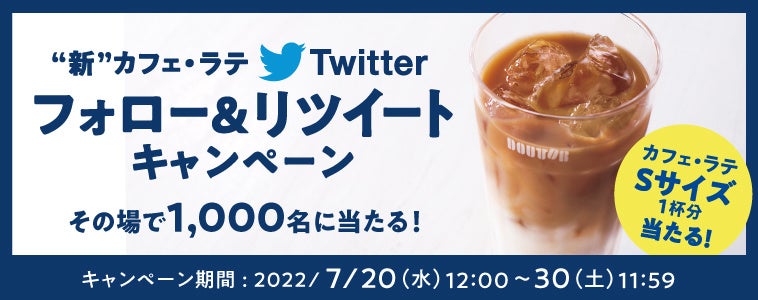 実施内容:ドトールコーヒー公式アカウント(@DoutorCoffee_co)をフォローし、対象ツイートをリツイートした方の中から抽選で合計1,000名様に、カフェ・ラテ/カフェ・オレ Sサイズ1杯分に相当するドトールグループ専用QUOカードPay330円が当たります。期間中は毎日12:00にツイート。翌日11:59までを1日とし10日間、毎日1回参加可能です。