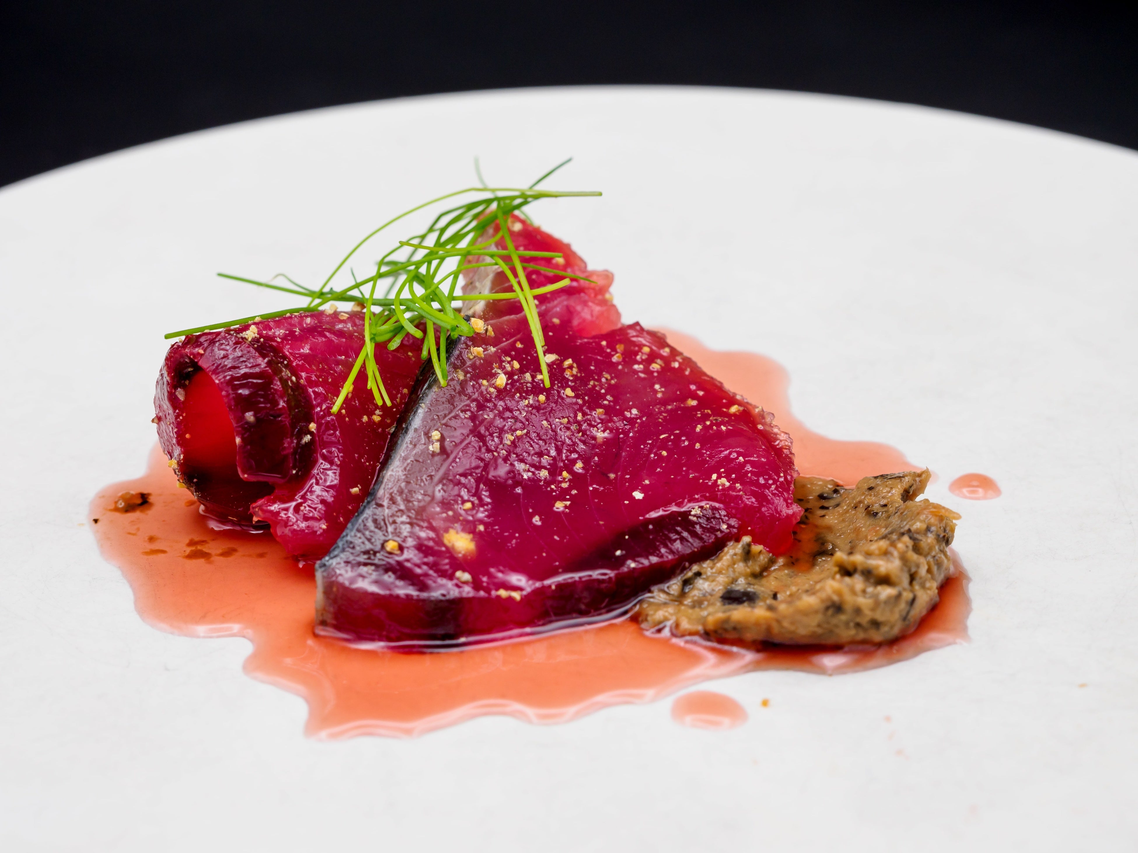 鰹は軽く表面を炙って香ばしさを出し、梅肉と黒オリーブのソースと、梅酒を使ったヴィネグレットソースで、カルパッチョ仕立てにいたしました。