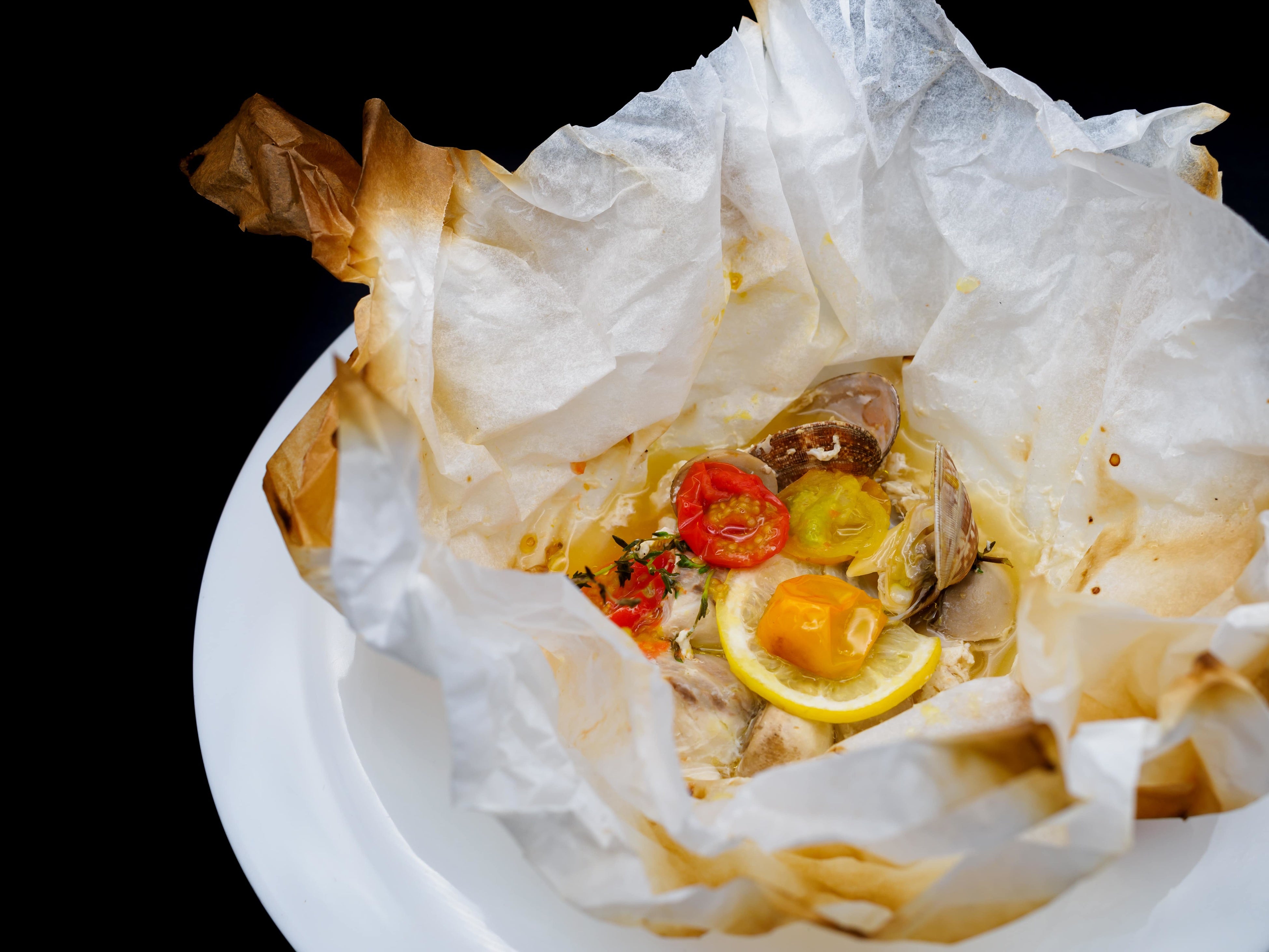 旬のスズキを紙で包み、旨味が逃げないようにオーブンで蒸し焼きにしました。
