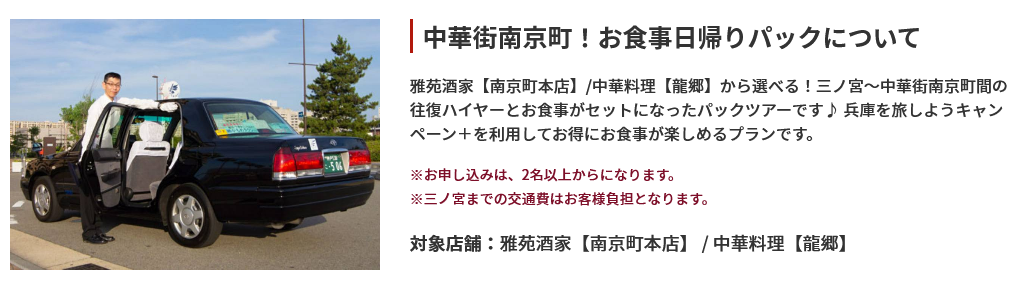 雅苑酒家【南京町本店】/中華料理【龍郷】から選べる!三ノ宮~中華街南京町間の往復ハイヤーとお食事がセットになったパックツアーです♪ 兵庫を旅しようキャンペーン+を利用してお得にお食事が楽しめるプランです。