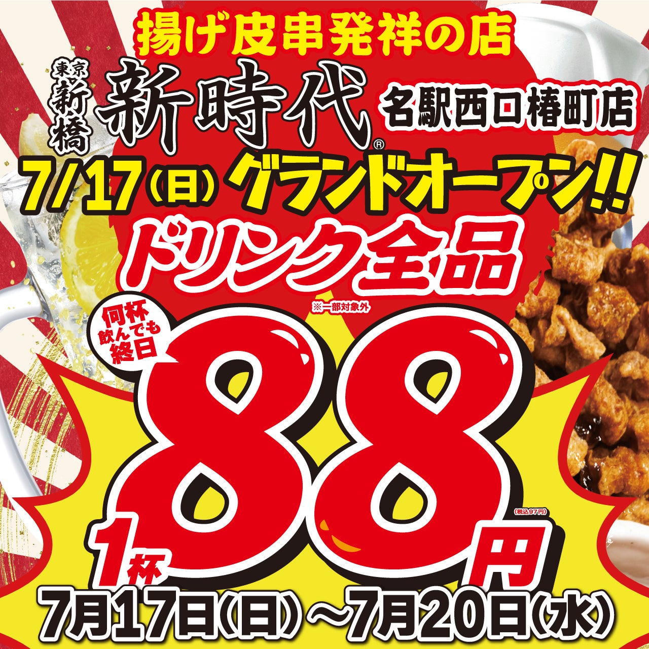 「新時代 名駅西口椿町店」のオープンを記念し、ドリンク全品を1杯88円(税込97円)でお楽しみ頂けるキャンペーンを開催します。
