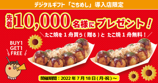 企画名:先着10,000名様限定!たこ焼を買う(贈る)と、「たこ焼無料券」がもらえるキャンペーン