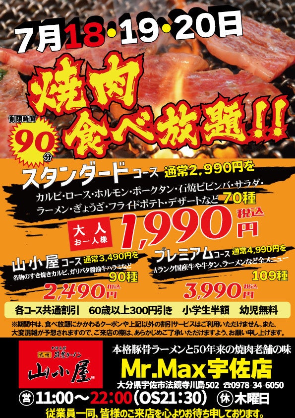 弊社(ワイエスフード株式会社)が運営しております『九州筑豊ラーメン焼肉山小屋ミスターマックス宇佐店』(大分県宇佐市)は、2022年3月18日(金)にリニューアルし、【”山小屋ブランド”の歴史と味を食べつくす!】をコンセプトに、焼肉併設店としてラーメンの提供はもちろん、若年層やファミリー層をターゲットとした焼肉の”食べ放題メニュー”を導入し、新たなスタイルで展開を始めました。