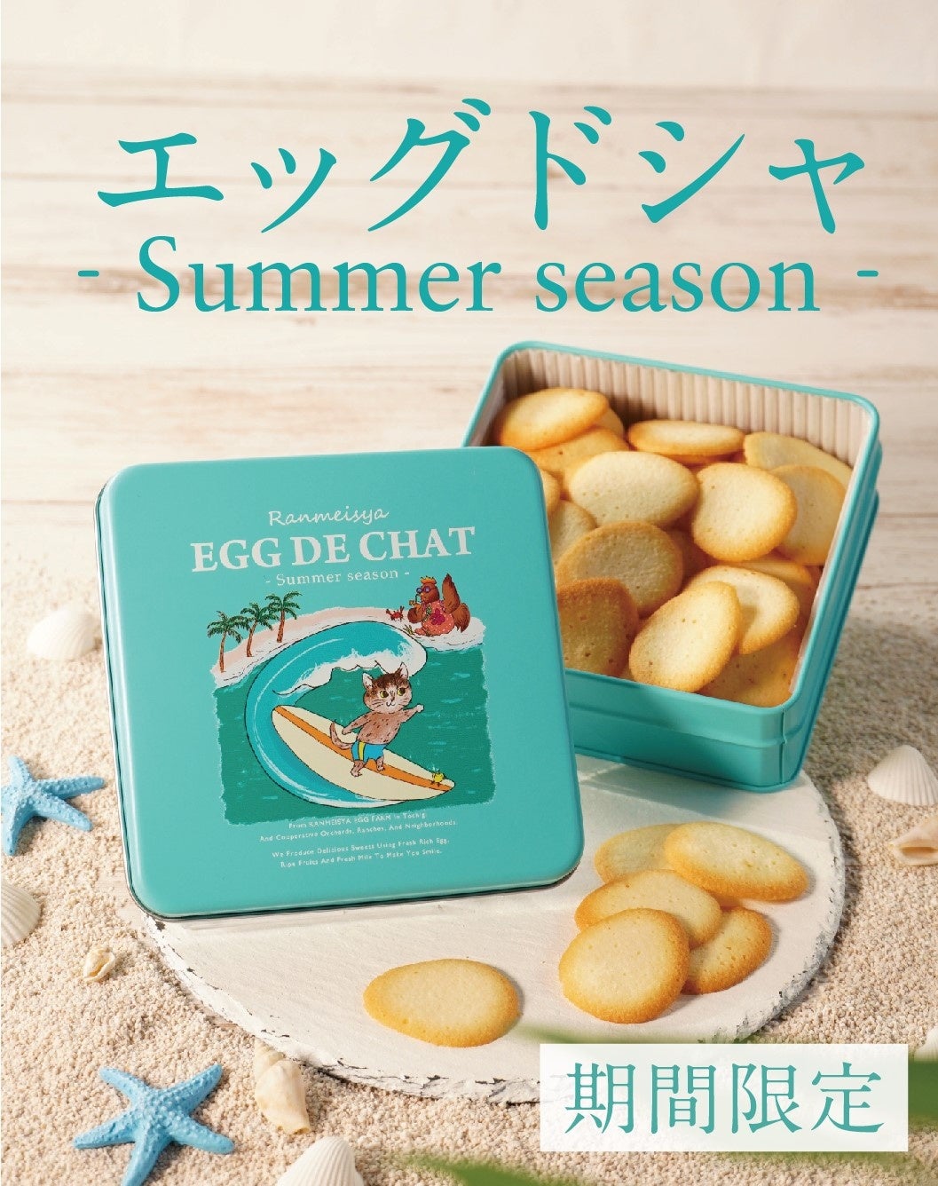 栃木の養鶏場有限会社「卵明舎」(本社:宇都宮市針ヶ谷町277-1)の人気商品「エッグドシャ」の新デザイン缶が登場しました。子猫とめんどりのお母さんをモチーフにした物語を描いた新デザインは【エッグドシャ サマーシーズン】。海でバカンスを楽しむ子猫とめんどり母さんの新たな物語にご注目ください!