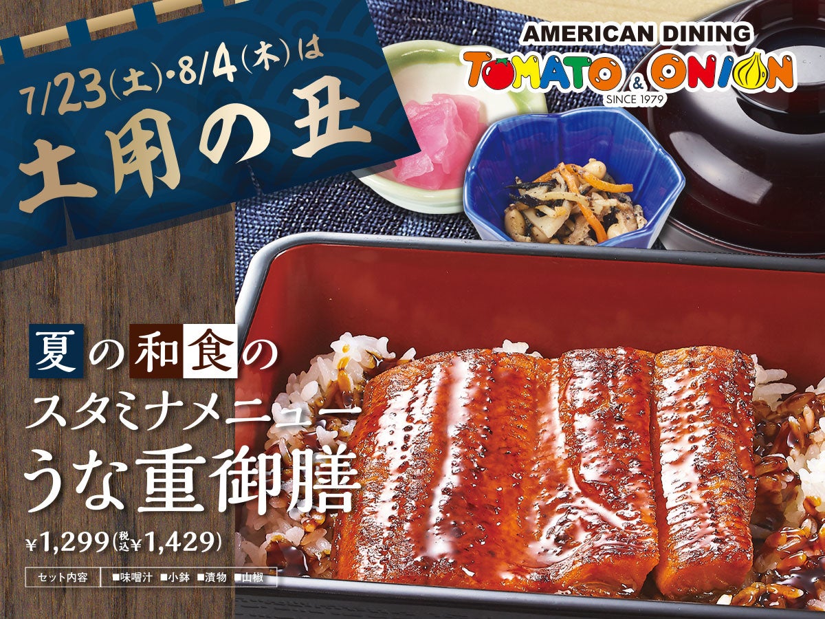 株式会社トマトアンドアソシエイツ(本社:兵庫県西宮市、代表取締役社長:小林 大二)が運営する、アメリカンダイニング「トマト&オニオン」では、夏のスタミナメニューとしてイートインでは『うな重御膳』、テイクアウトではよりお得な価格で「うな丼」を販売しております。また、2022年7月22日~2022年8月4日は公式アプリでさらにお得になるクーポンを配信します。