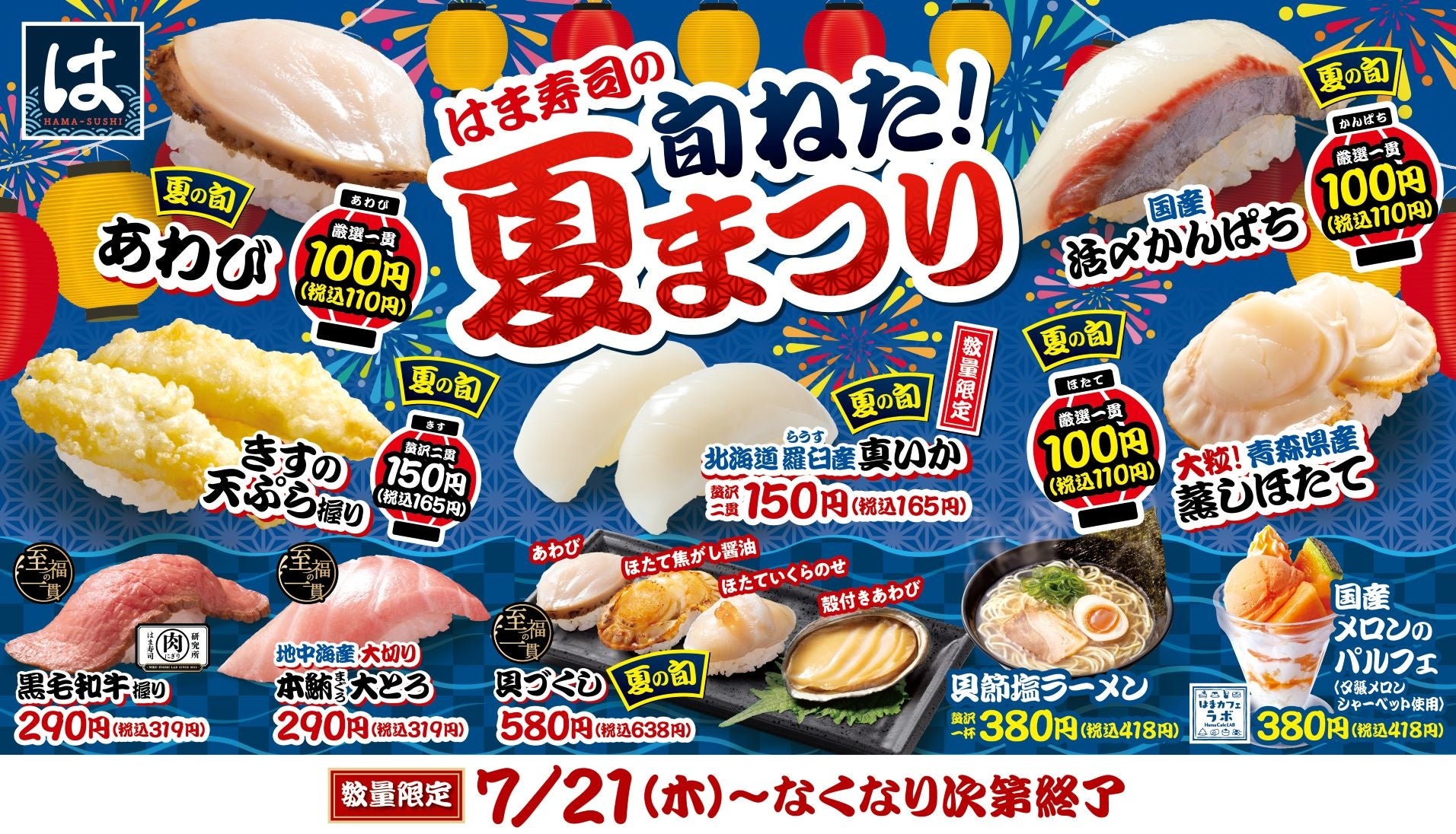 株式会社はま寿司(代表取締役社長:遠藤 哲郎 本社:東京都港区)が展開する100円寿司チェーン「はま寿司」は、7月21日(木)から、はま寿司厳選の夏に旬を迎えるネタを販売する「はま寿司の旬ねた!夏まつり」を全国の店舗で開催します。