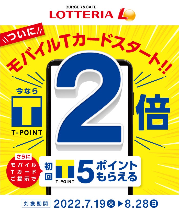 期間中に、ロッテリア店舗のお会計時に、「モバイルTカード」をご提示いただき、Tポイントを1ポイント以上貯めていただくと、通常付与のTポイントが2倍貯まります。